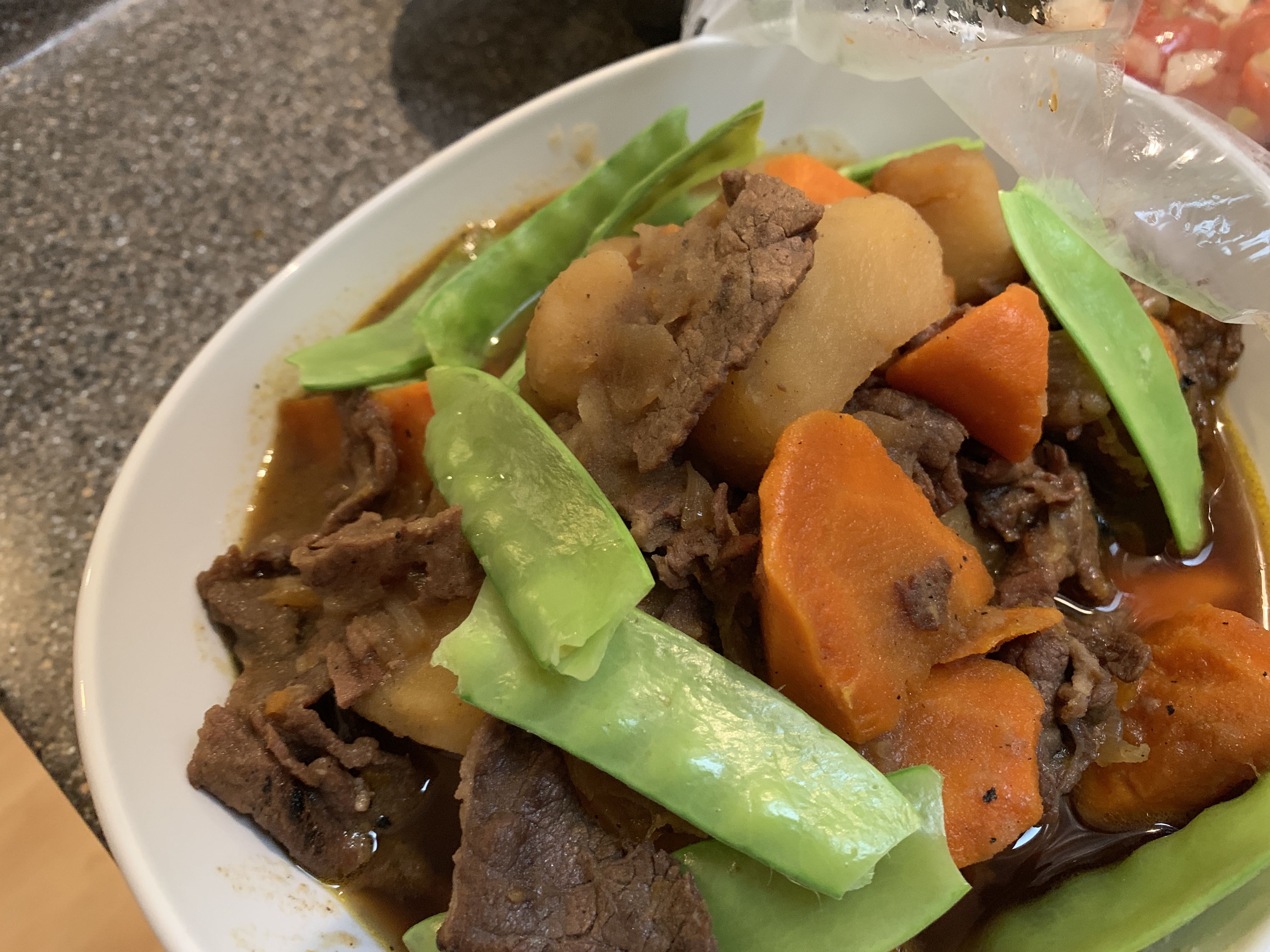 I was watching the newly released Terrace House series on Netflix recently and in one episode, they cooked nikujaga for dinner for the housemates. That got me thinking that the teri beef has basically the same flavor profile as nikujaga so I went to KTA and picked up some potatoes, carrots, onions, ginger, and snow peas.