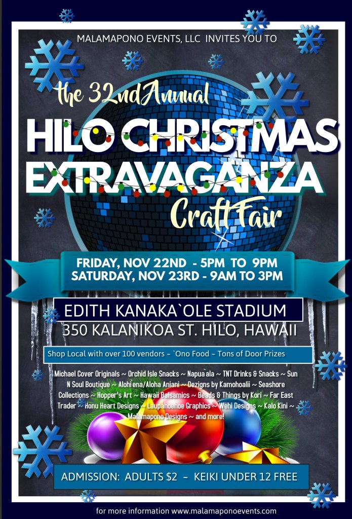 Hilo, Hawaii – Malamapono Management, LLC, presents the 32nd Annual Hilo Christmas Extravaganza Craft Fair on November 22-23, 2019 at the Edith Kanaka’ole Tennis Stadium. The Extravaganza features 100 of the best artisans and crafters from the Big Island and throughout the State of Hawaii and California.