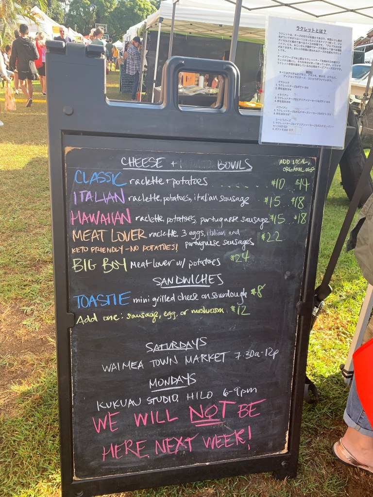 My daughter had a soccer game at HPA in Waimea so my husband and I made a day of it by going a little early so we could stop at the Parker School Farmer’s Market where I got to try the Italian bowl and a Toastie sandwich from Cheese, Please. I especially loved the Toastie grilled cheese sandwich with mushrooms. The bread was crispy, the cheese was gooey. It was perfect. If you’re in Hilo, you can find Cheese, Please on Mondays at Kukuau Studio.