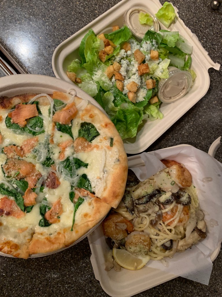 It was so convenient! We shared a Caesar salad, salmon pizzette, and a shrimp Alfredo linguine. Living Hilo Style.