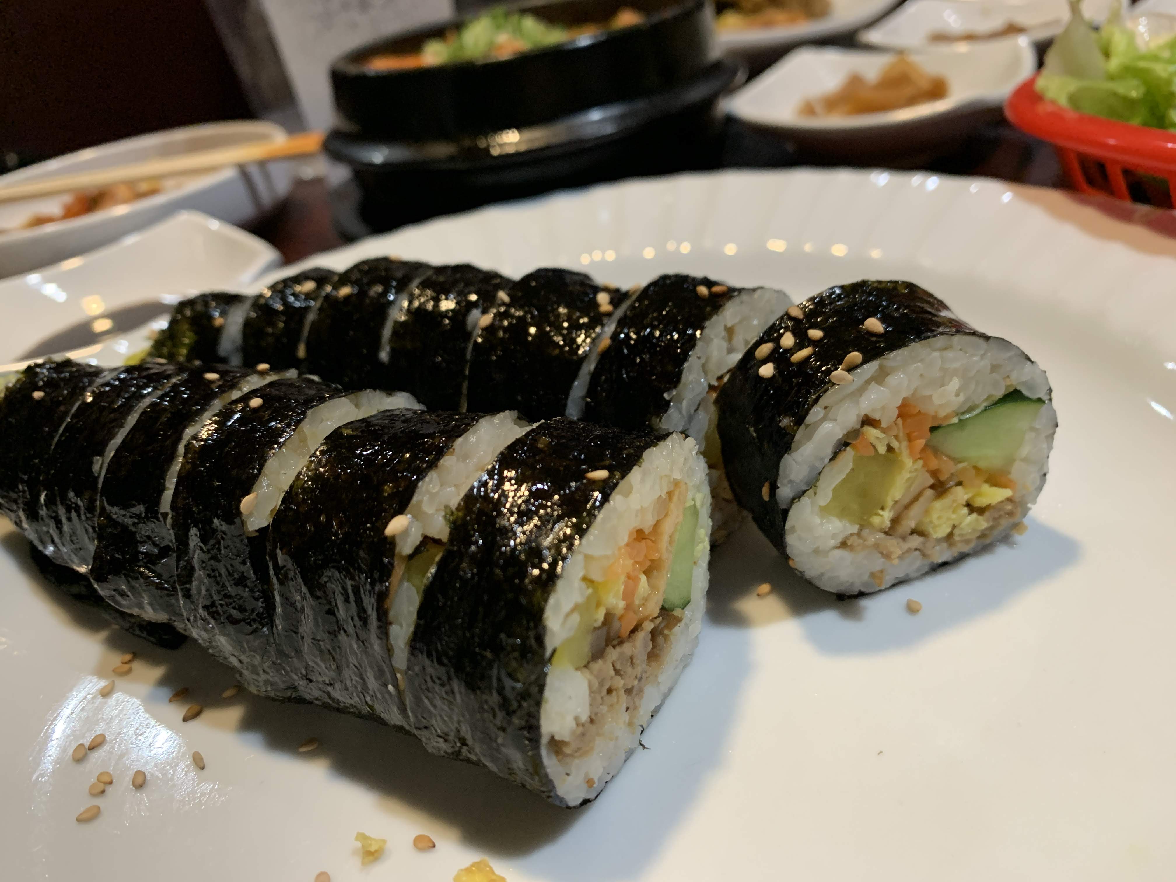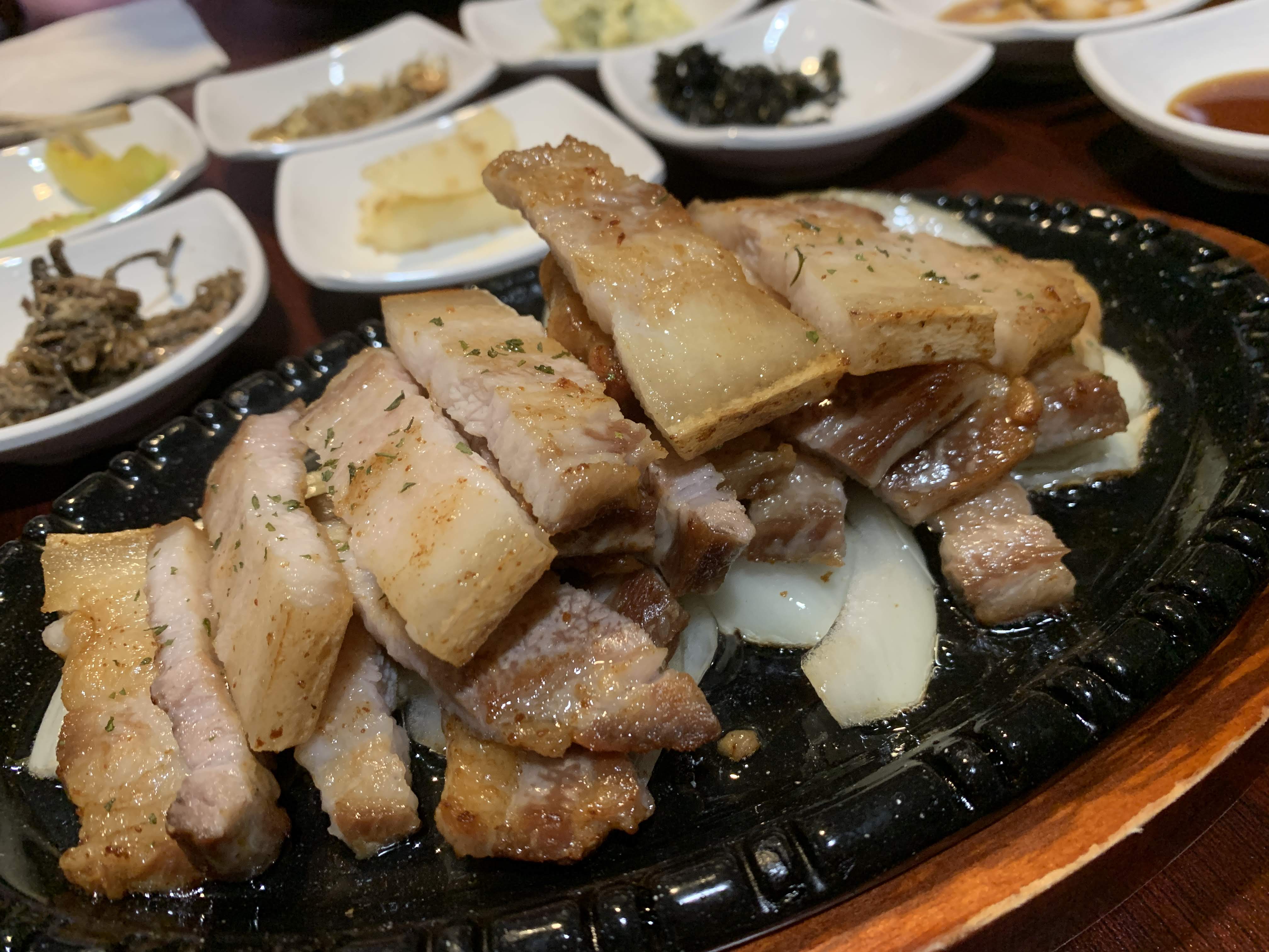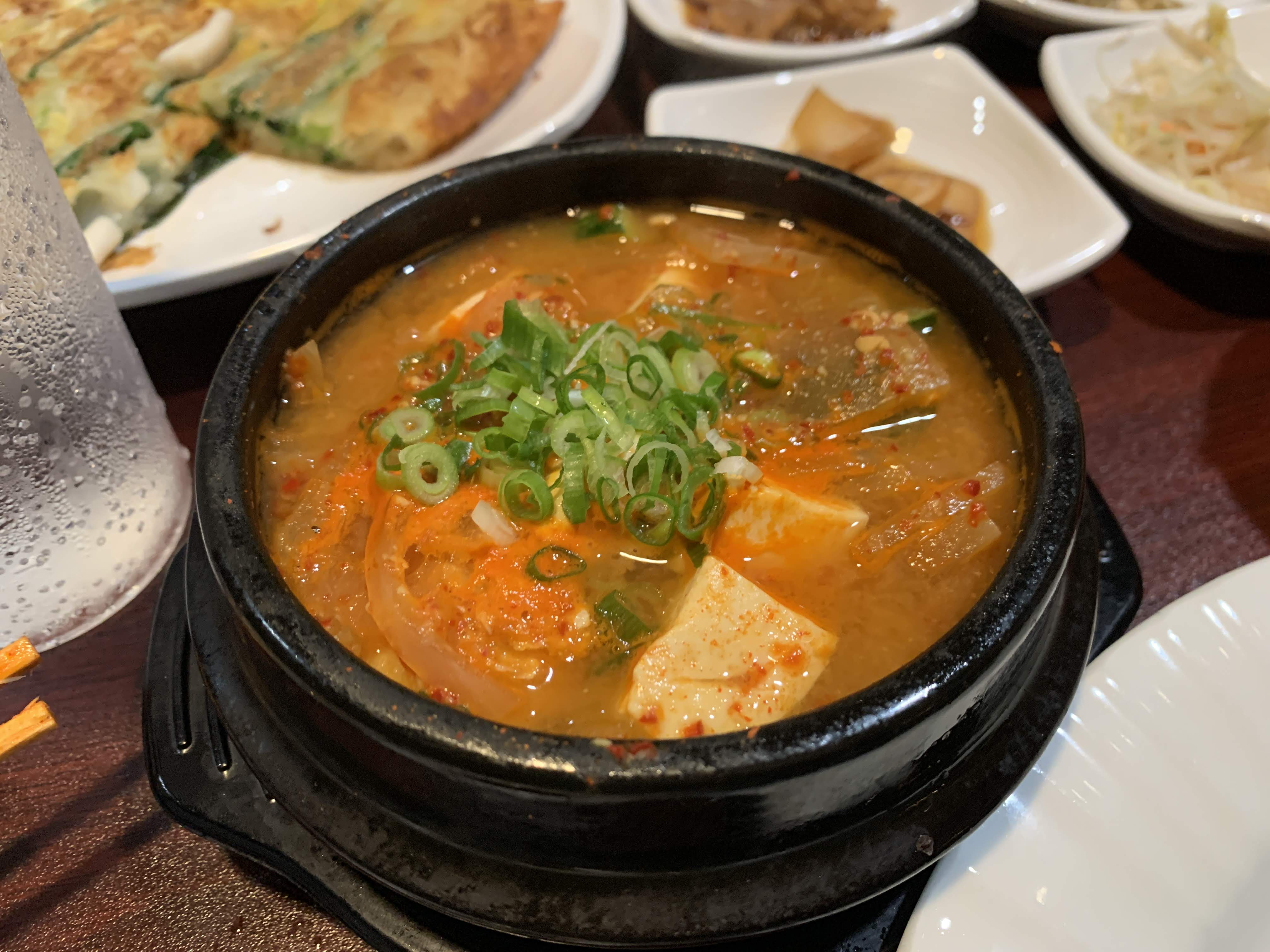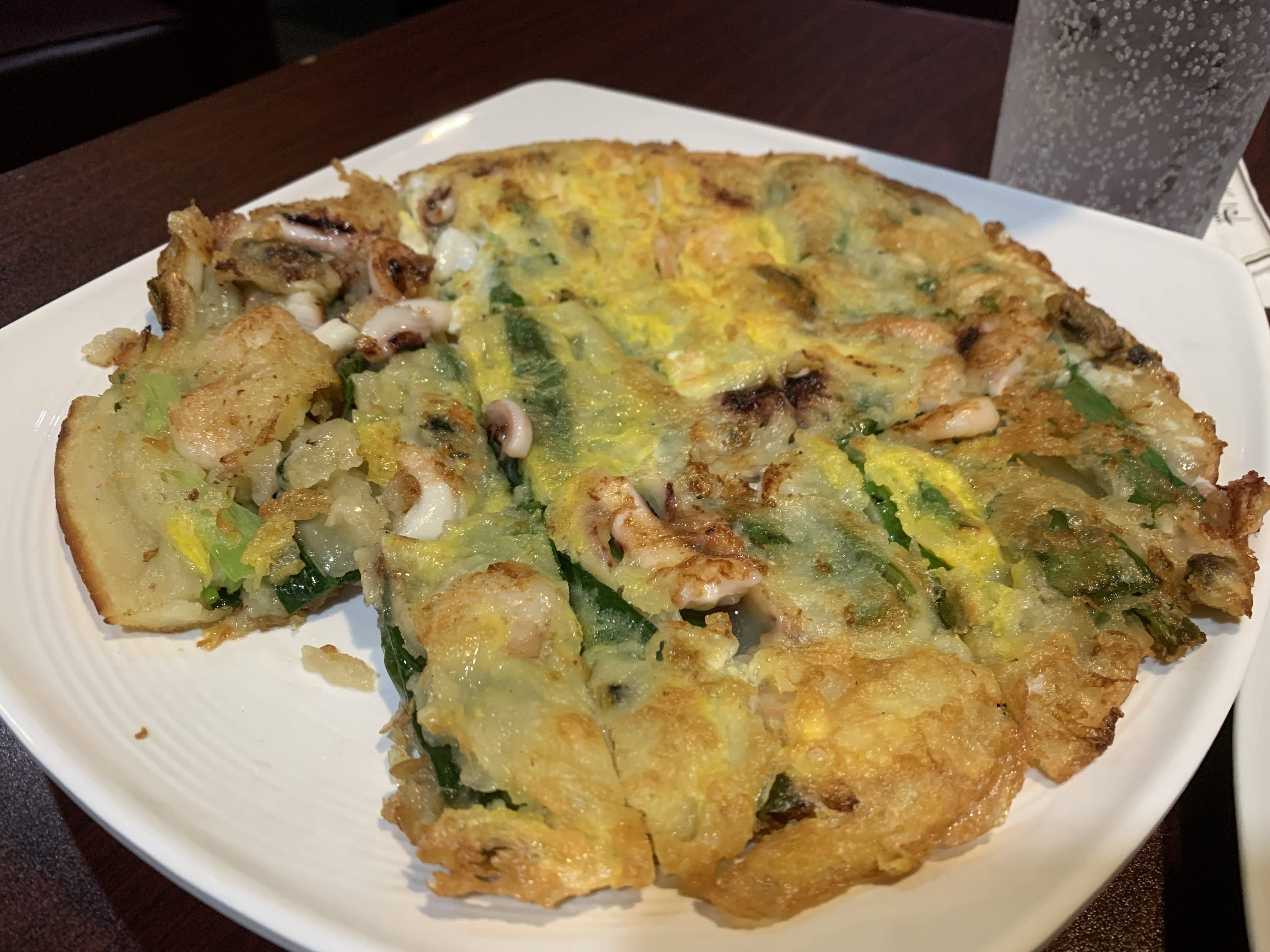 When I went this time, we could order a lot of things since there were more of us. We enjoyed all the banchan that went with our pajeon which is bigger than Misty’s head, samgeopsal, crispy fried chicken, kimbap, chigae. Oh, we did enjoy some soju that you can find at Kadota Liquor too.