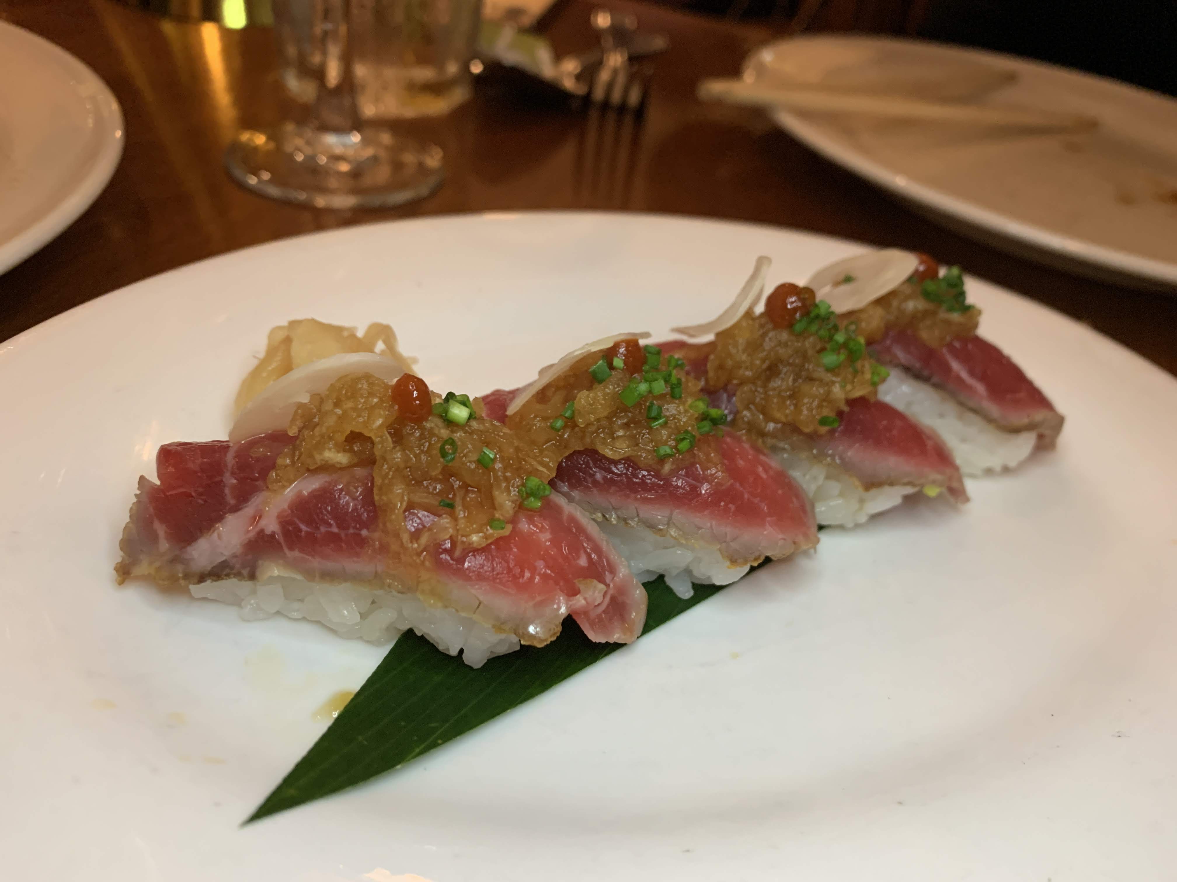 - Beef Tataki Sushi — seared, rare, dry-aged NY steak, grated daikon, dashi ponzu, garlic, chili, Koshihikari rice