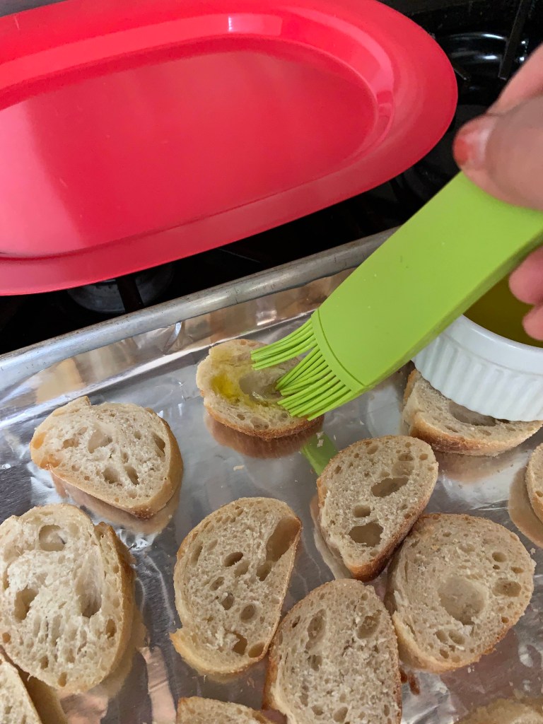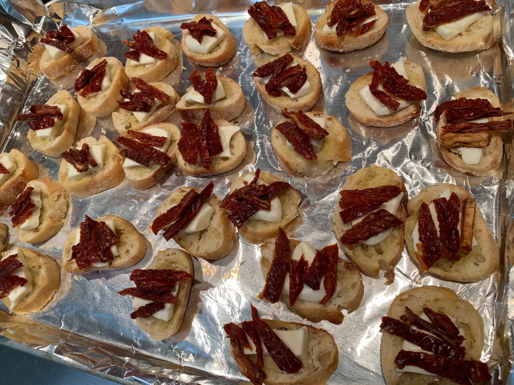 I asked her for the recipe and she willingly shared it. It requires only four ingredients. Bread, olive oil, mozzarella, and sun-dried tomatoes. I asked her for the recipe and she willingly shared it. It requires only three ingredients. Bread, mozzarella, and sun-dried tomatoes. I had I had a Costco baguette at home. I also had sun-dried tomatoes from Italy that my friend brought home for me. All I needed to get was the mozzarella.