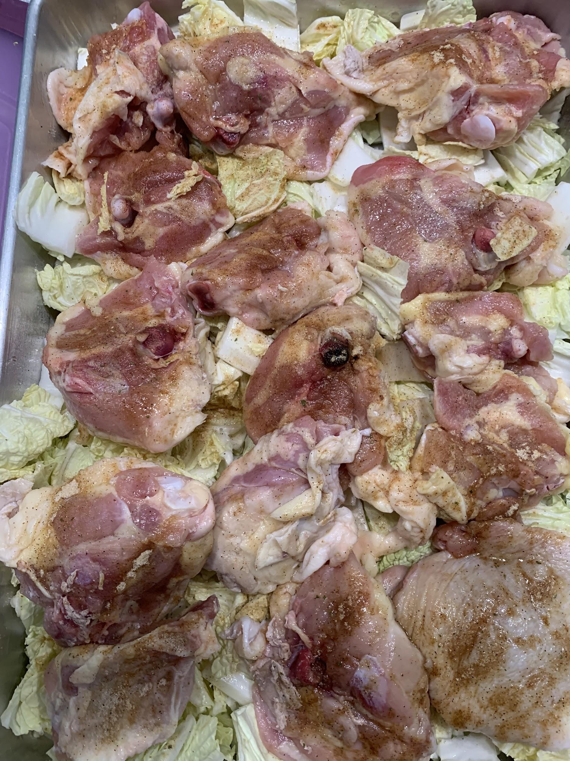 - Place the thighs on the cabbage and season with salt on both sides then add the NOH seasoning mix to both sides as well. Be sure to use the entire package on the thighs.