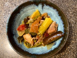 I wanted to buy as many veggies as I could so I decided to make my version of pinakbet. I picked up some crispy pork belly from KTA and sliced it up and heated it up in a big pot. I added some chopped onions and garlic and a couple of chunks of ginger to the pan and let the aromas fill the house. I chopped some tomatoes and added that to the pot. Next, I added some chopped bittermelon, zucchini, and eggplant. I add some patis to the mixture with some salt and pepper and that is it.
