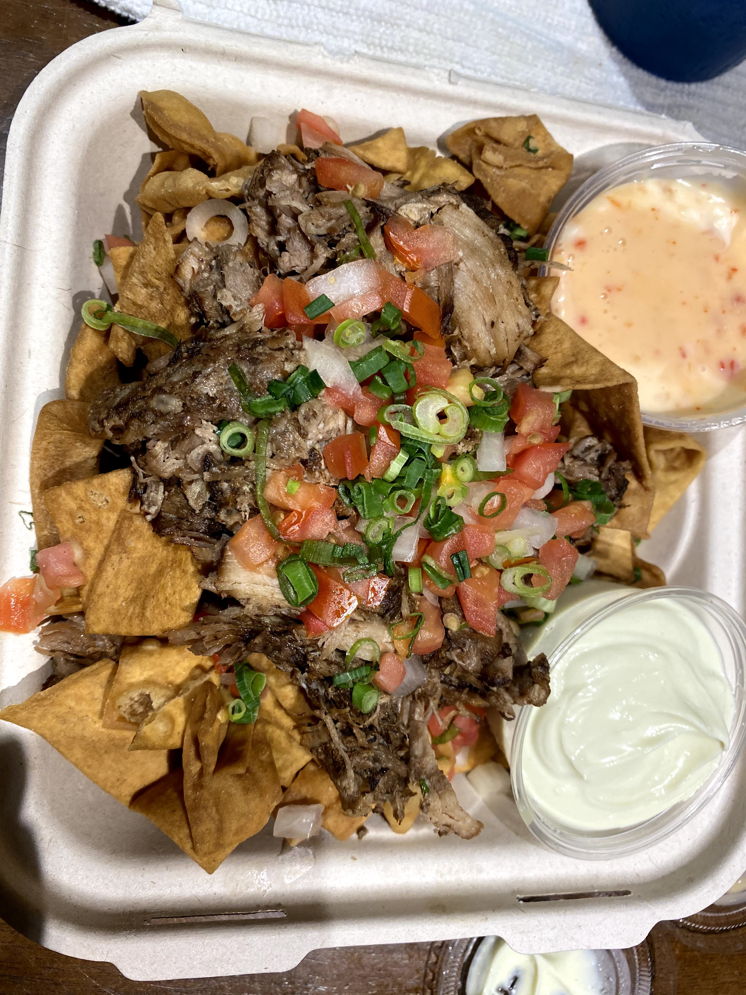 - Kalua nachos: kalua pig, tomato, onion, on a bed of Maebo won ton chips, with sweet chili aioli and wasabi aioli