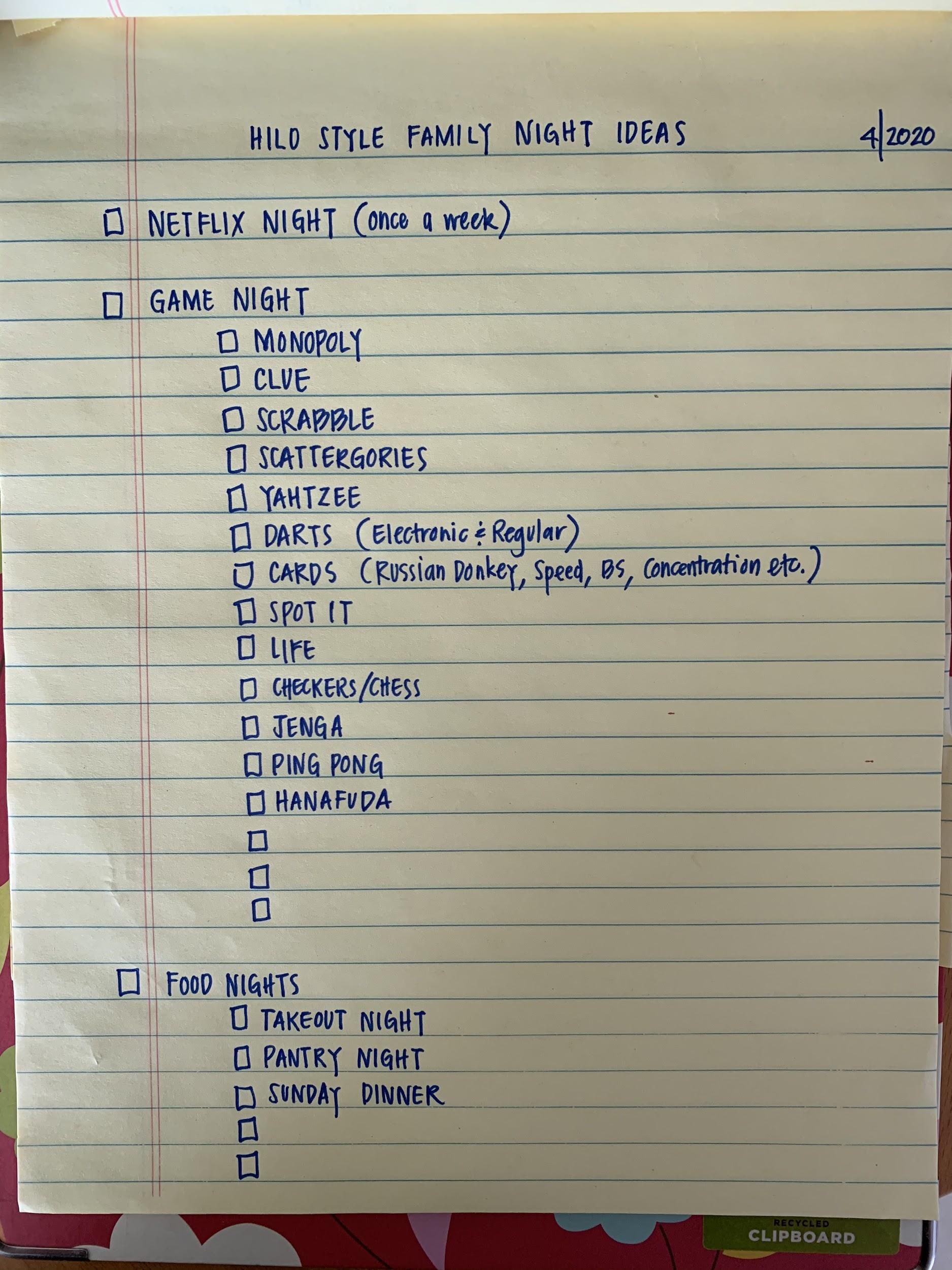 I have another list for you this week. Due to Corona, I’ve slowly begun organizing “nights” at my house to help combat boredom and all of the video game playing! I use these “nights” as a way for us to spend time together instead of everyone staring at an electronic device. Over the last two weeks, my family has played games they’ve never played before (Clue!) and all of the laughing (and confusion!) has been priceless. We also finished a game of Monopoly which none of us had ever done before. My list is currently limited to what I have at home as I’m trying to use what we have instead of going crazy on Amazon.