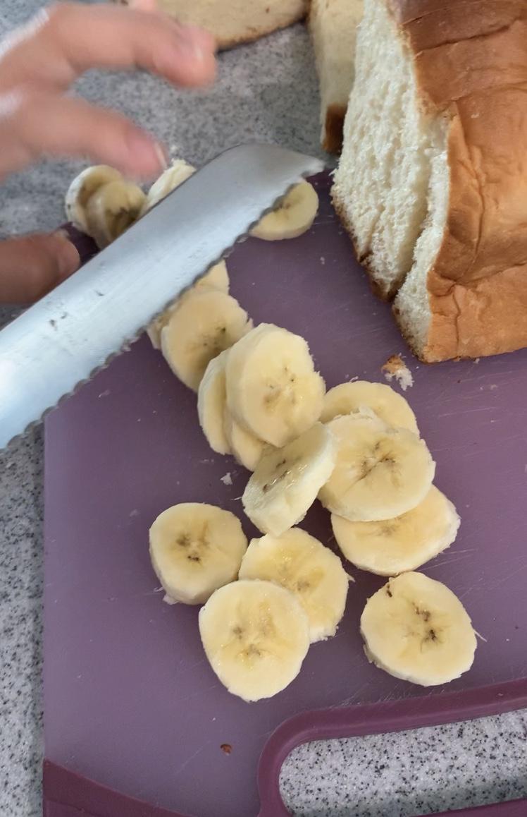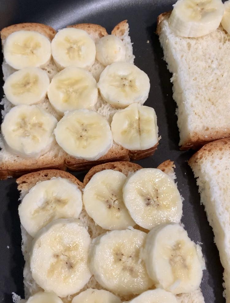 - Place 4 slices of bread on a large cutting board (that you used to slice the sweetbread) and cover each slice in bananas. Top with the remaining four slices of bread to make 4 “banana sandwiches.”