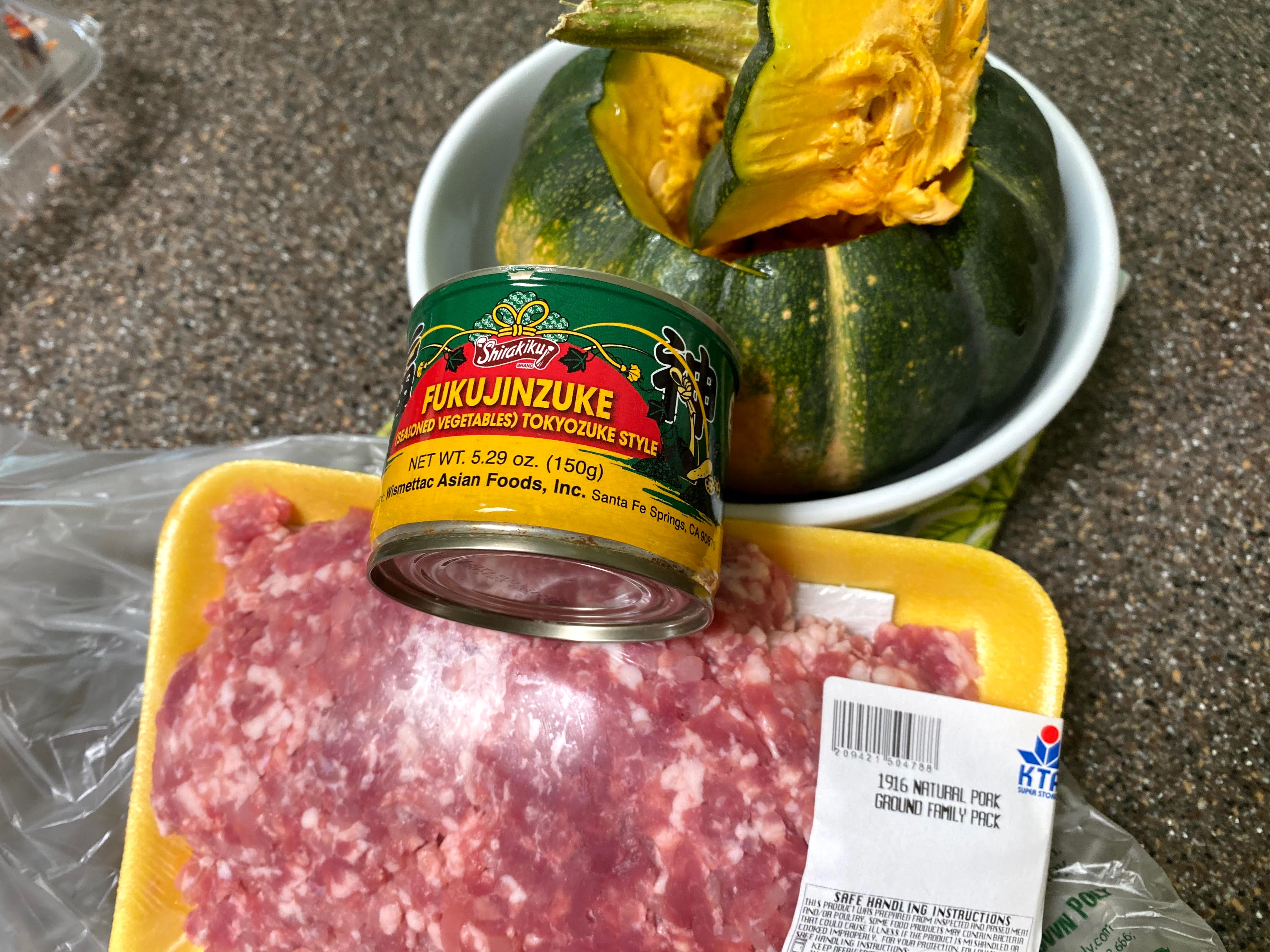 When it is cook enough to handle, cut around the stem so that you have a lid. Scoop out the seeds and strings. (If you want to grow your own kabocha, throw the seed fillings out into your yard where you have some room for a kabocha patch.) In a bowl, mix ground pork with a can of Fukujinzuke Tokyozuke style. My kabocha was small so I used about half a pound of ground pork with one 5.29 oz can of fukujinzuke. If you have a larger kabocha, you can use more pork and add more fukujinzuke. Stuff the pork mixture into the kabocha and replace the lid. Cover the kabocha with plastic wrap and microwave it for about 15-20 minutes depending on the size of your kabocha.