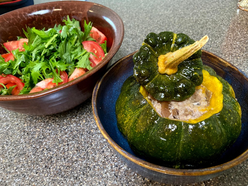 My friend Aileen Fuke made a stuffed kabocha for me once and I loved it. I asked her for the recipe and it was so incredibly easy! It is something that is easy to make for potlucks and parties. I recently had the perfect opportunity to make this dish. I had just harvested some kabocha from my garden and I also got invited to a party. This is how to make this super easy and super yummy dish. Put the kabocha in a bowl with just a little water and microwave the whole kabocha for about 2 minutes to soften it so that it is easy to cut.