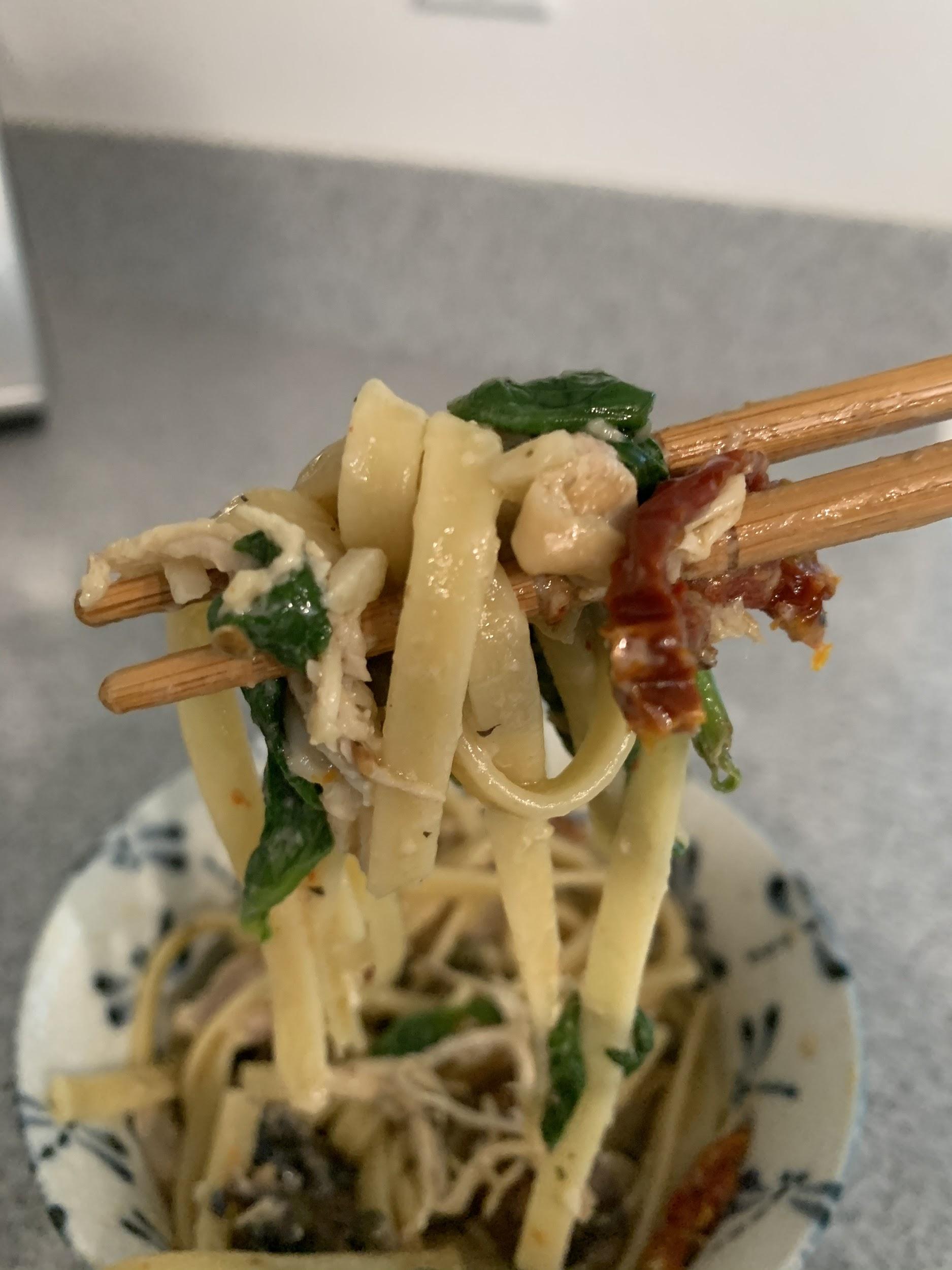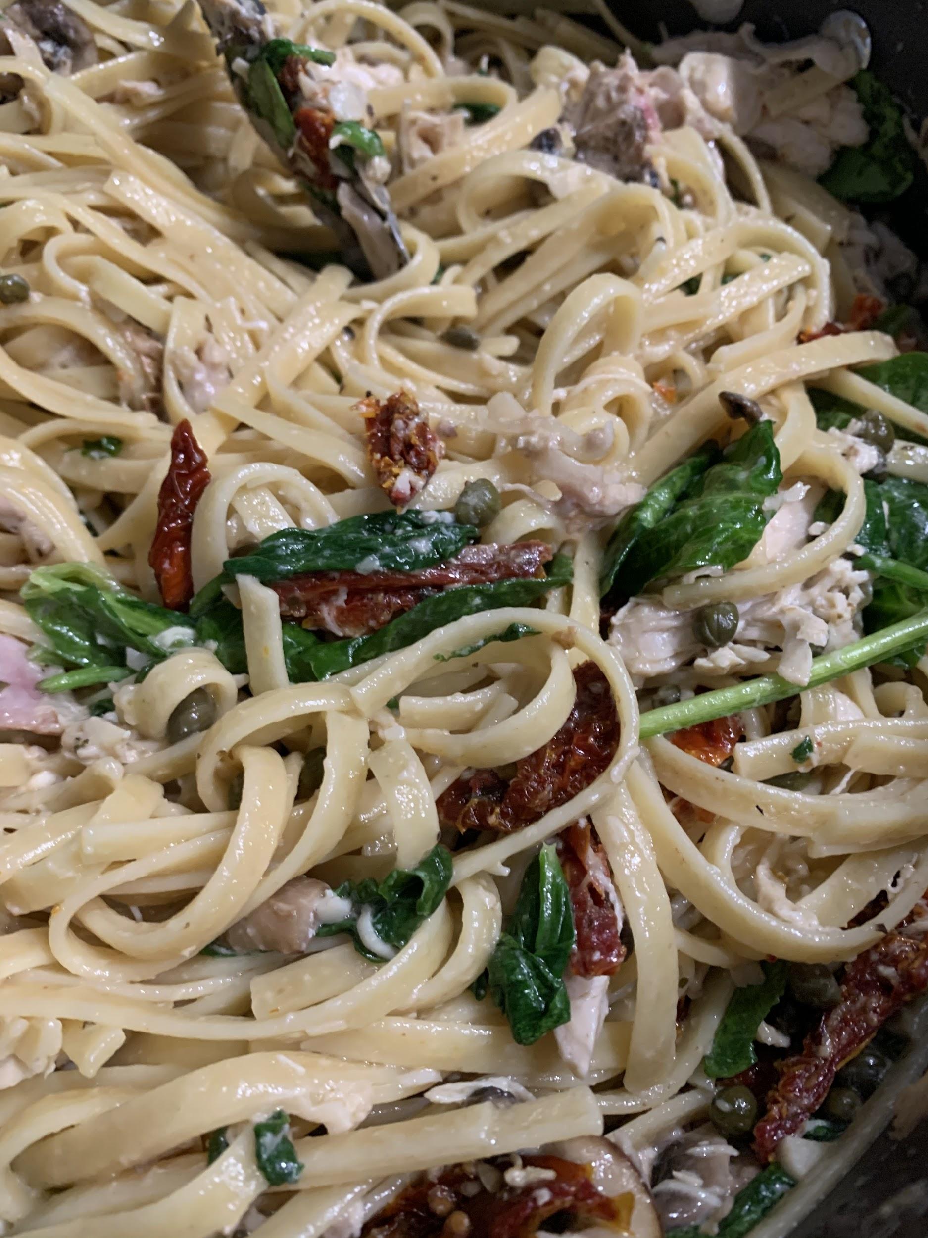 - Add the chicken, capers, sun dried tomatoes, and spinach (it’ll wilt quickly) to the pasta. Add salt, pepper, additional pasta water and more cheese if desired.