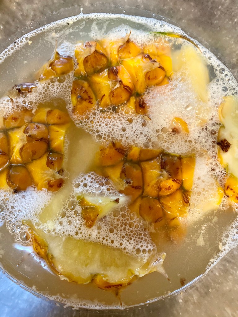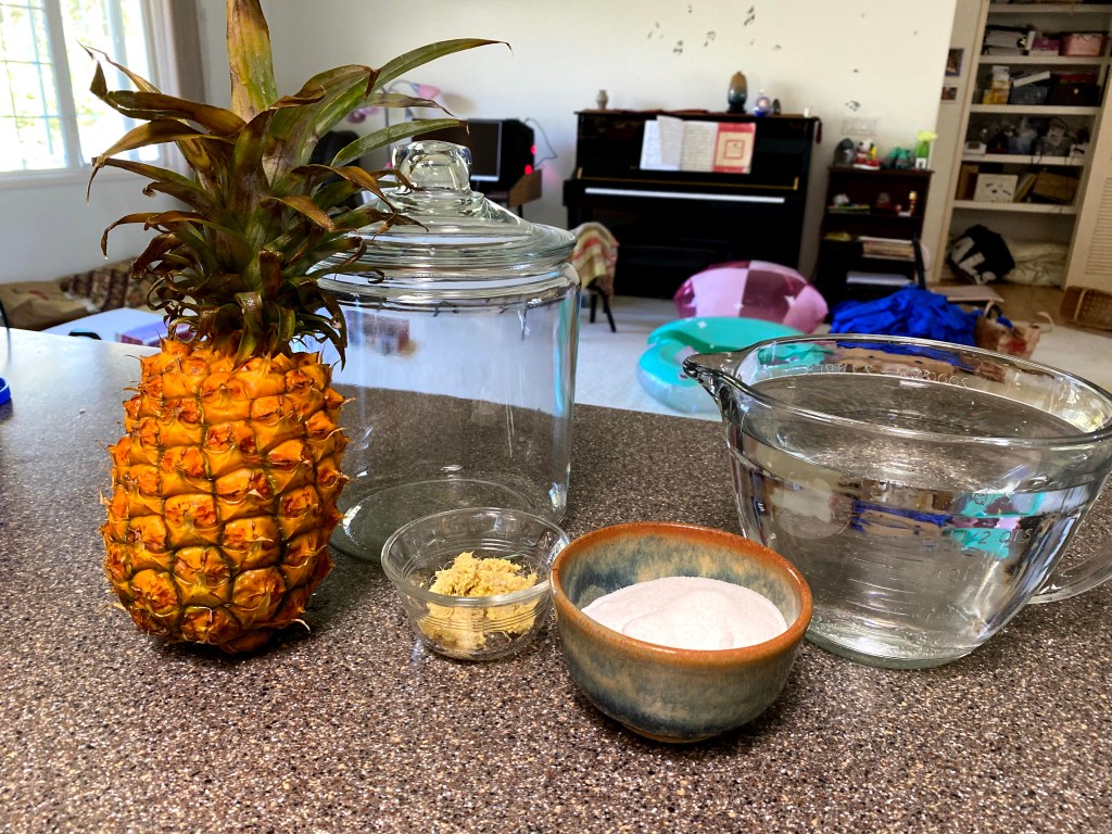 I signed up to take an AirBnB online class called Making Homemade Medicinal Sodas. According to the description, I’m learning how to make an immune-boosting, bubbly soda. Anything immune-boosting is a plus right now. I never heard of tepache before this class but that is what we were being taught. I made my tepache with a pineapple from KTA, ginger from my garden instead of the typical cinnamon and cloves, sugar, and water.