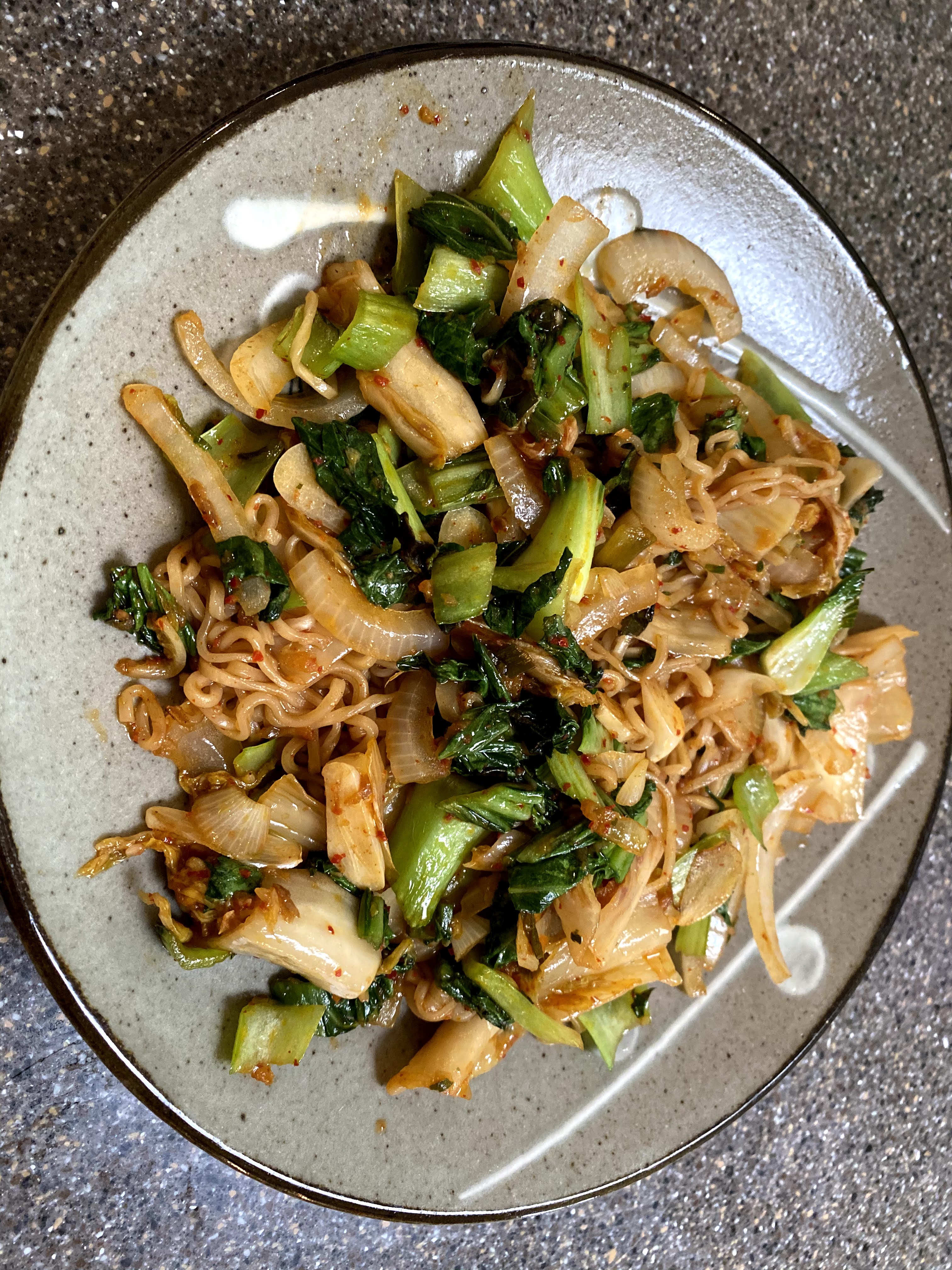In a pan, I fried garlic, onion, baby bok choy, and kimchi in a pan. When the veggies were ready, I added the cooked noodles to the pan and sprinkled the seasoning over everything and tossed it together. Shiitake mushrooms would have been a delicious addition as well as Spam. I didn’t have the mushrooms and didn’t want to open a can of Spam so this was it.