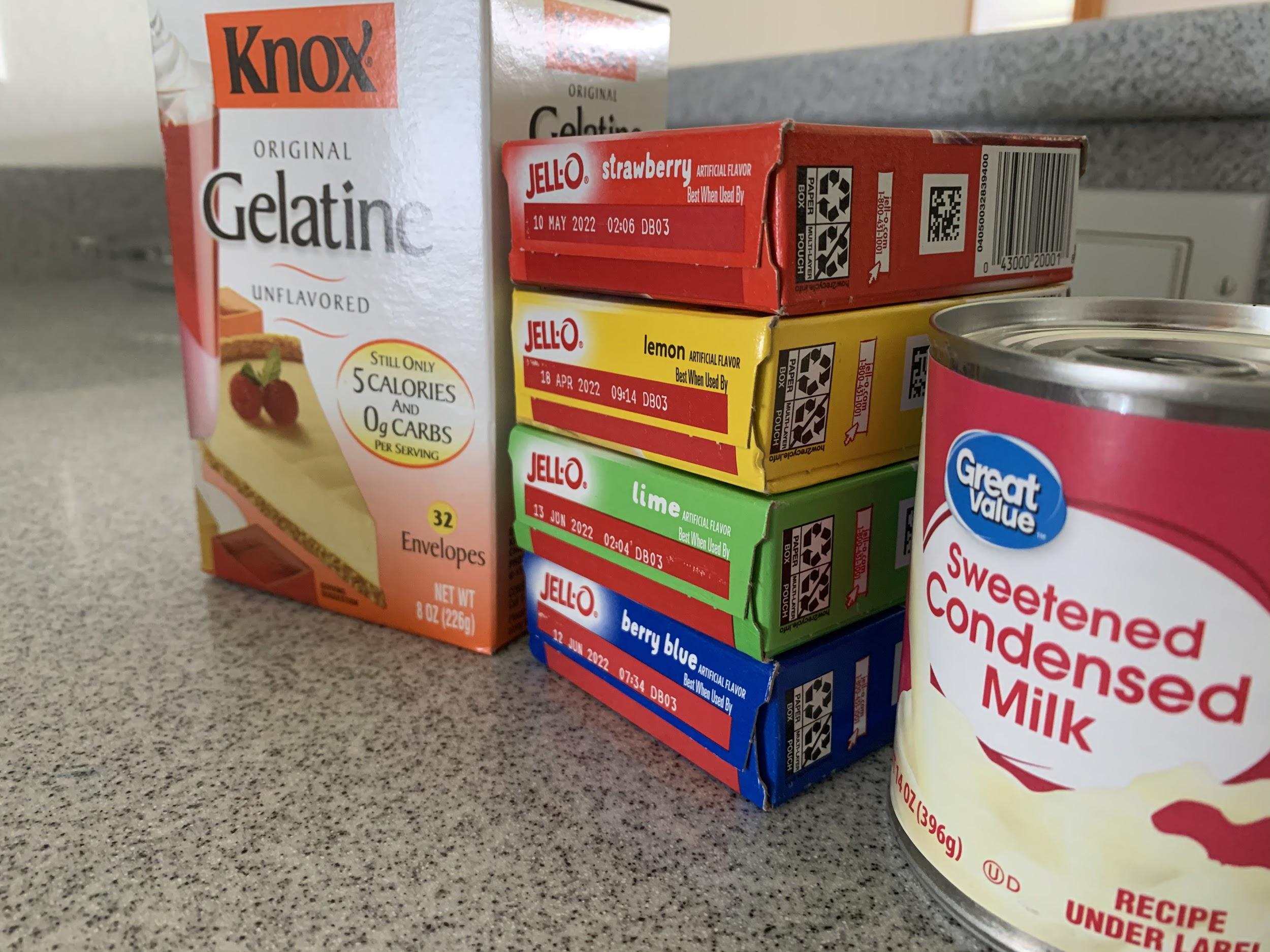 - 4 (3 oz.) boxes JELL-O (strawberry, lemon, lime and berry blue)