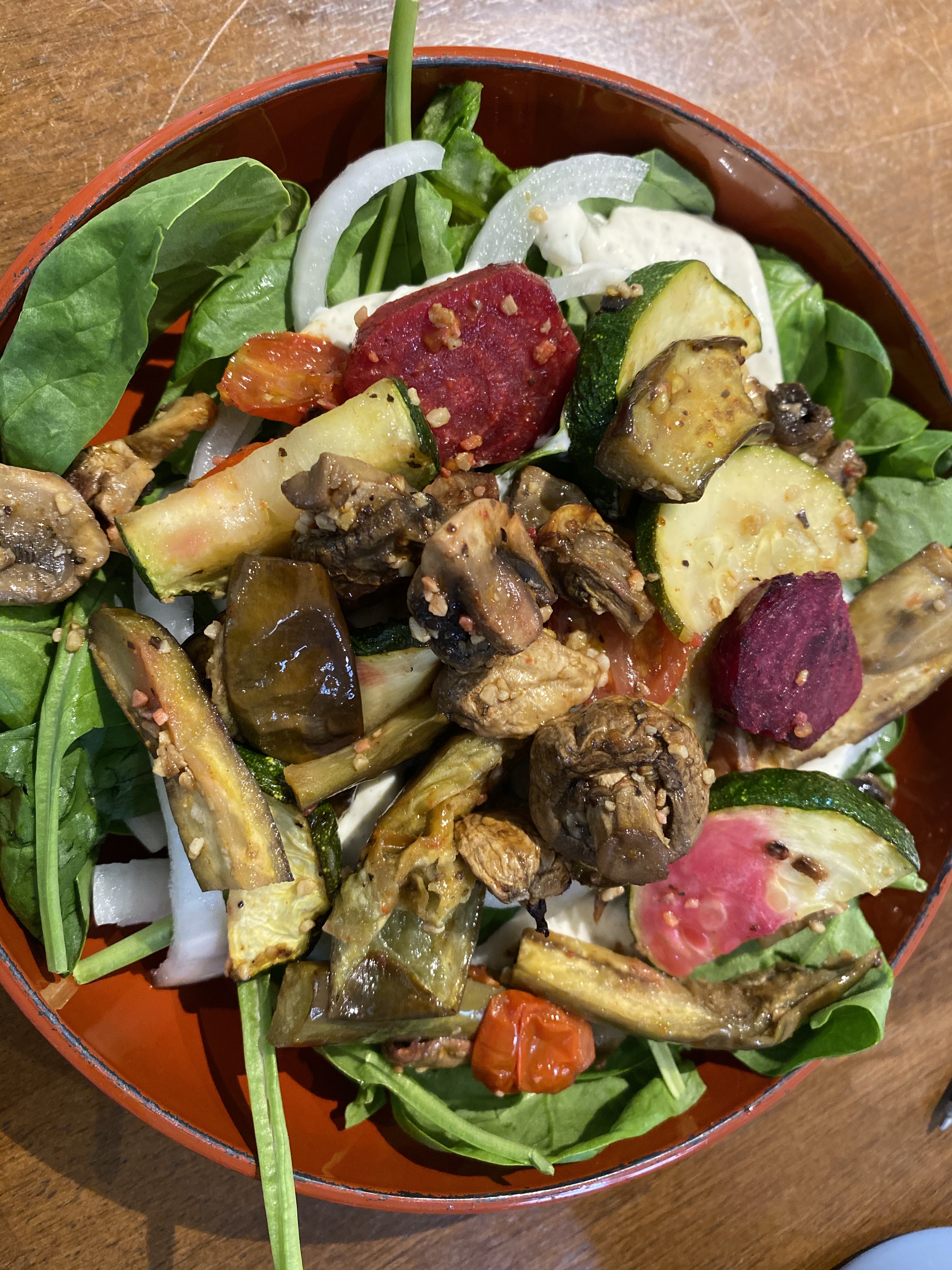 I love eating this Greek spinach pasta salad that is so easy to whip up. It is a great potluck dish since it turns out to be quite a big salad. We aren’t having any potlucks these days but I was still wanting to eat this salad so I decided to try it without the pasta. I took a zucchini and some mushrooms from my fridge and some eggplants, beets, and tomatoes from my garden and sliced them and marinated them in some olive oil, garlic, salt, and lemon pepper. After the veggies soaked up some of that good flavor, I popped the veggies into my Instant Vortex Plus air fryer for about 12 minutes at 400 degrees. When it was done, I let it cool to room temperature. When I was ready to eat, I just tossed some spinach and sliced onions with some lemon juice, olive oil, mayonnaise, and Cavender’s Greek seasoning and put the grilled veggies on the spinach.