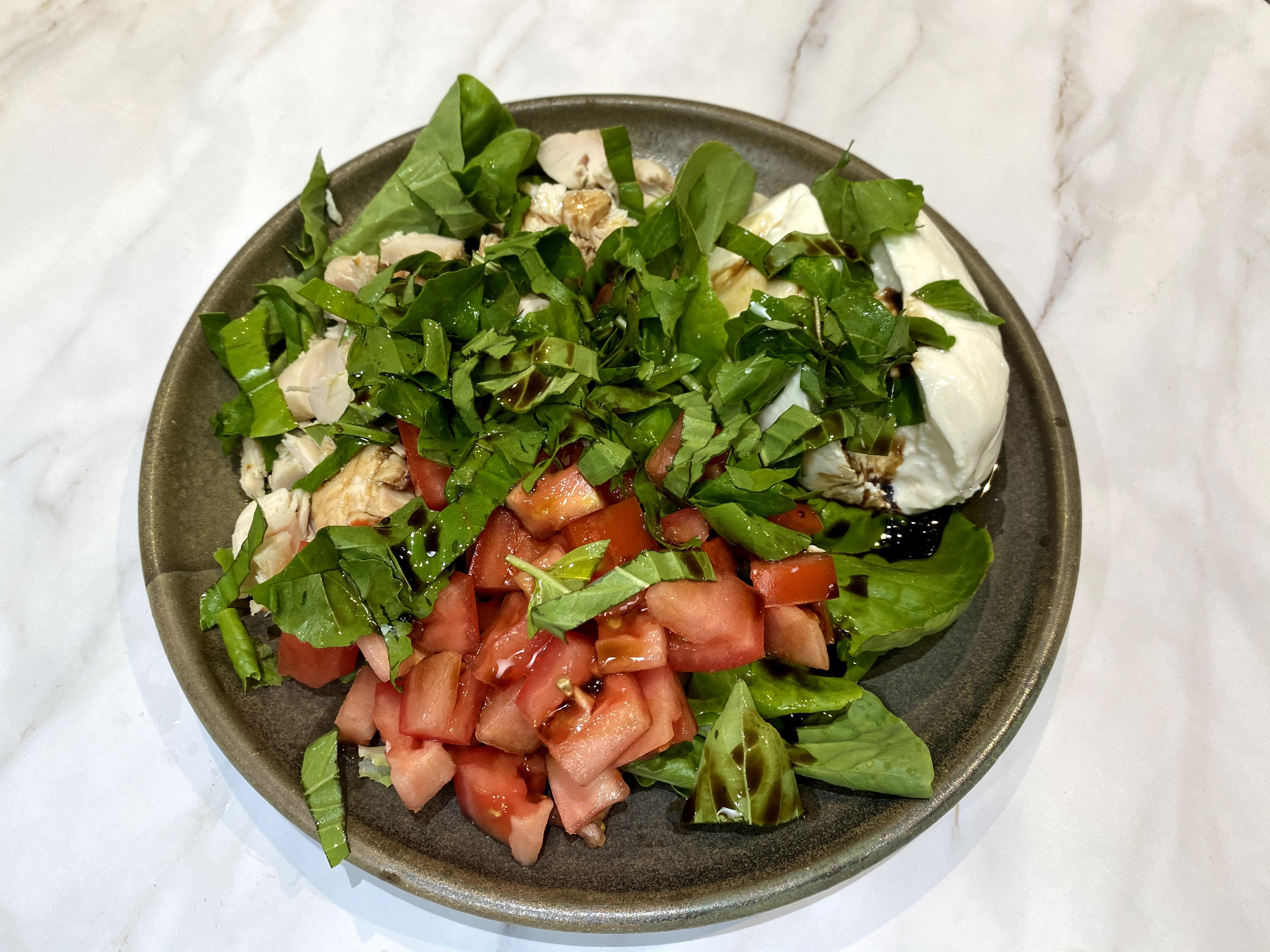 One day, I had some leftover Costco rotisserie chicken in the fridge. I also had some black truffle burrata and Roma tomatoes that I got from KTA. I went into my backyard garden and found some butter lettuce, arugula, and basil and made my lunch!