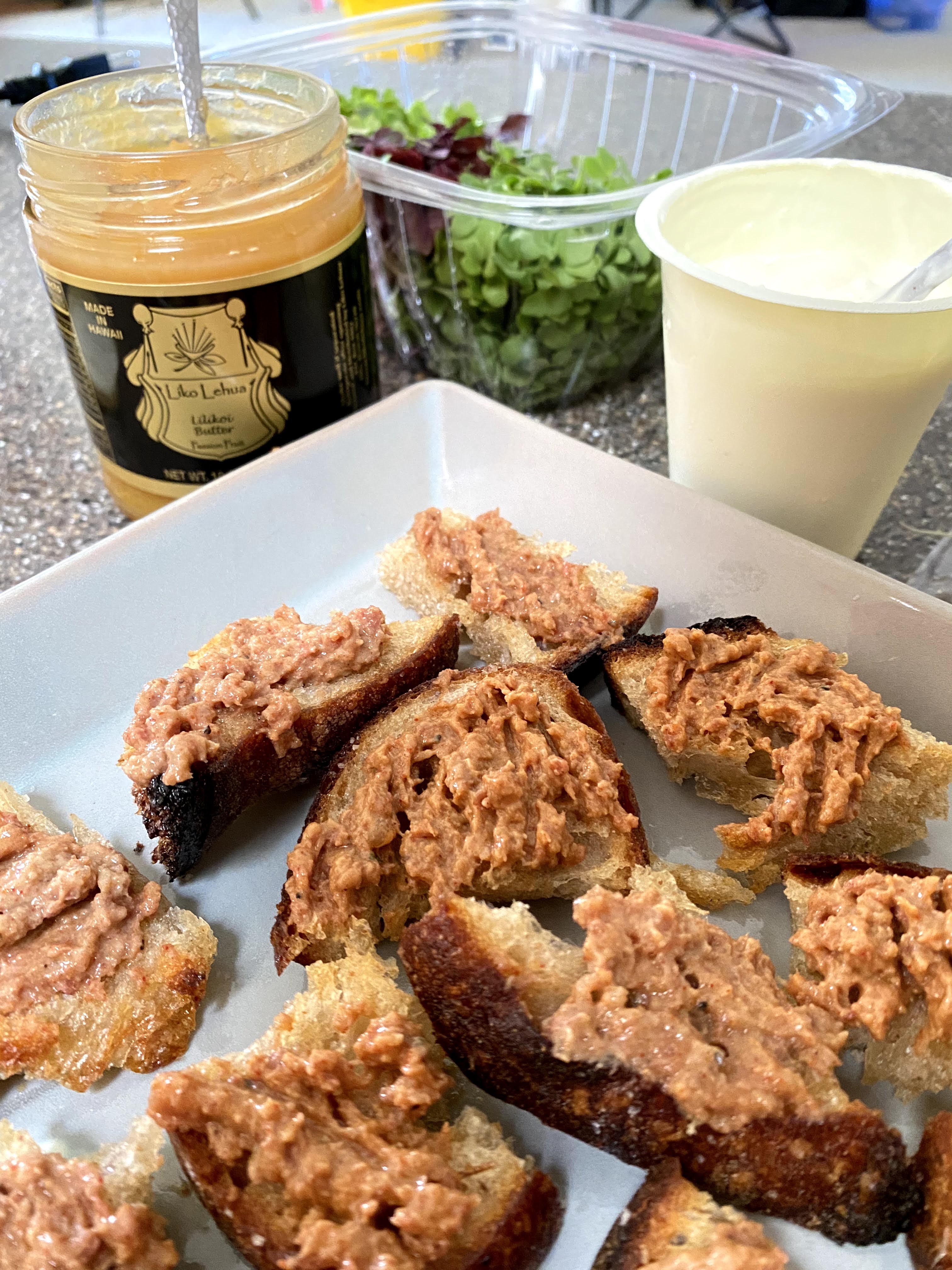 The ‘nduja is sourced from the farm’s Royal Berkshire herd raised in Honoka’a and the herd is pasture-raised, hormone and antibiotic free and fed a variety of organic foods including ‘ulu, bananas, papaya, and mac nuts. At Napua, they serve the spread on a bread with pretty pickled veggies. I ordered some ‘nduja and had it shipped to me since I didn’t have plans to go to Waikoloa and couldn’t pick it up from Napua. I put the spread on some bread with a dollop of crème fraiche and a drizzle of lilikoi butter for a sweet, creamy, slightly spicy combo. It is a great pupu!