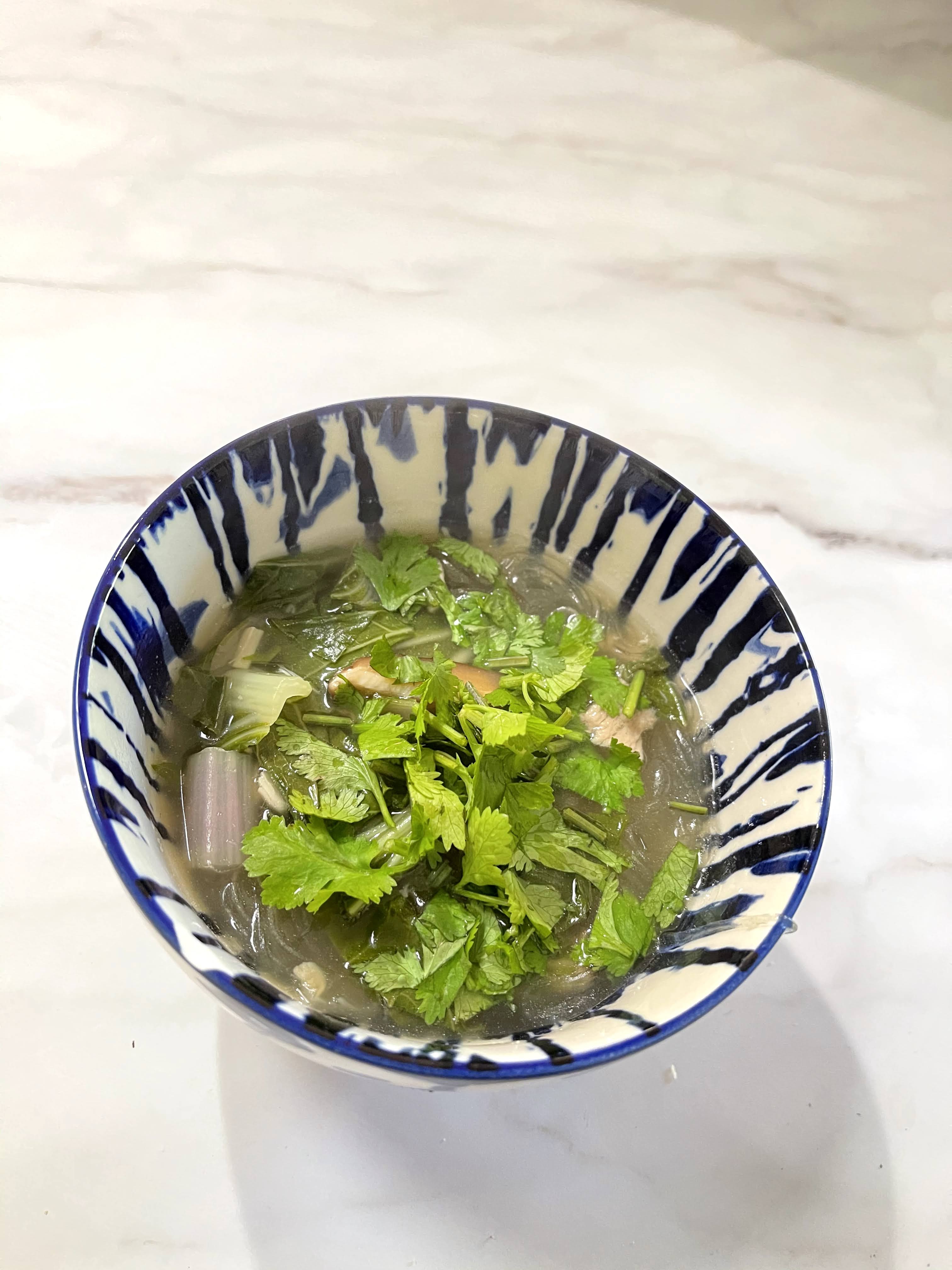 Once the soup was ready — in about 5 minutes, I put it into a bowl and topped it with some cilantro and let it warm me up and prepare me for the day. Super quick and satisfying. Living Hilo Style.