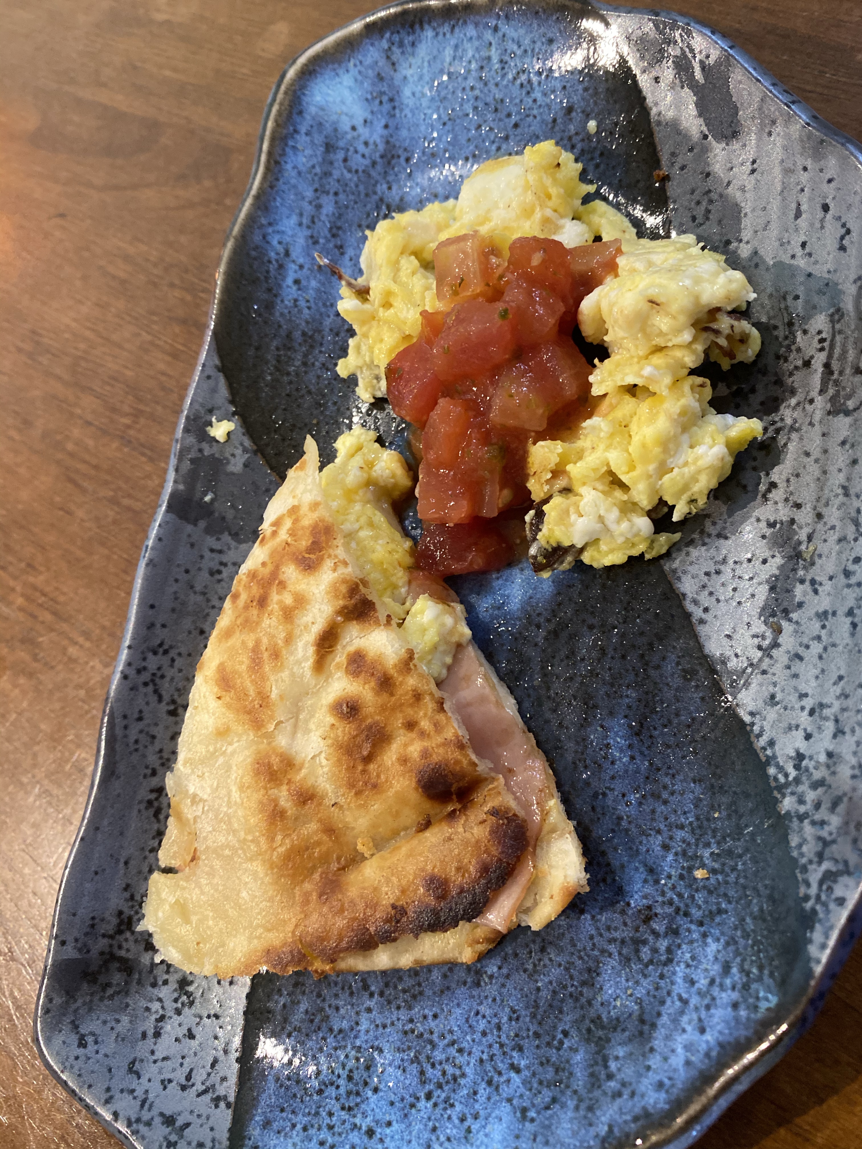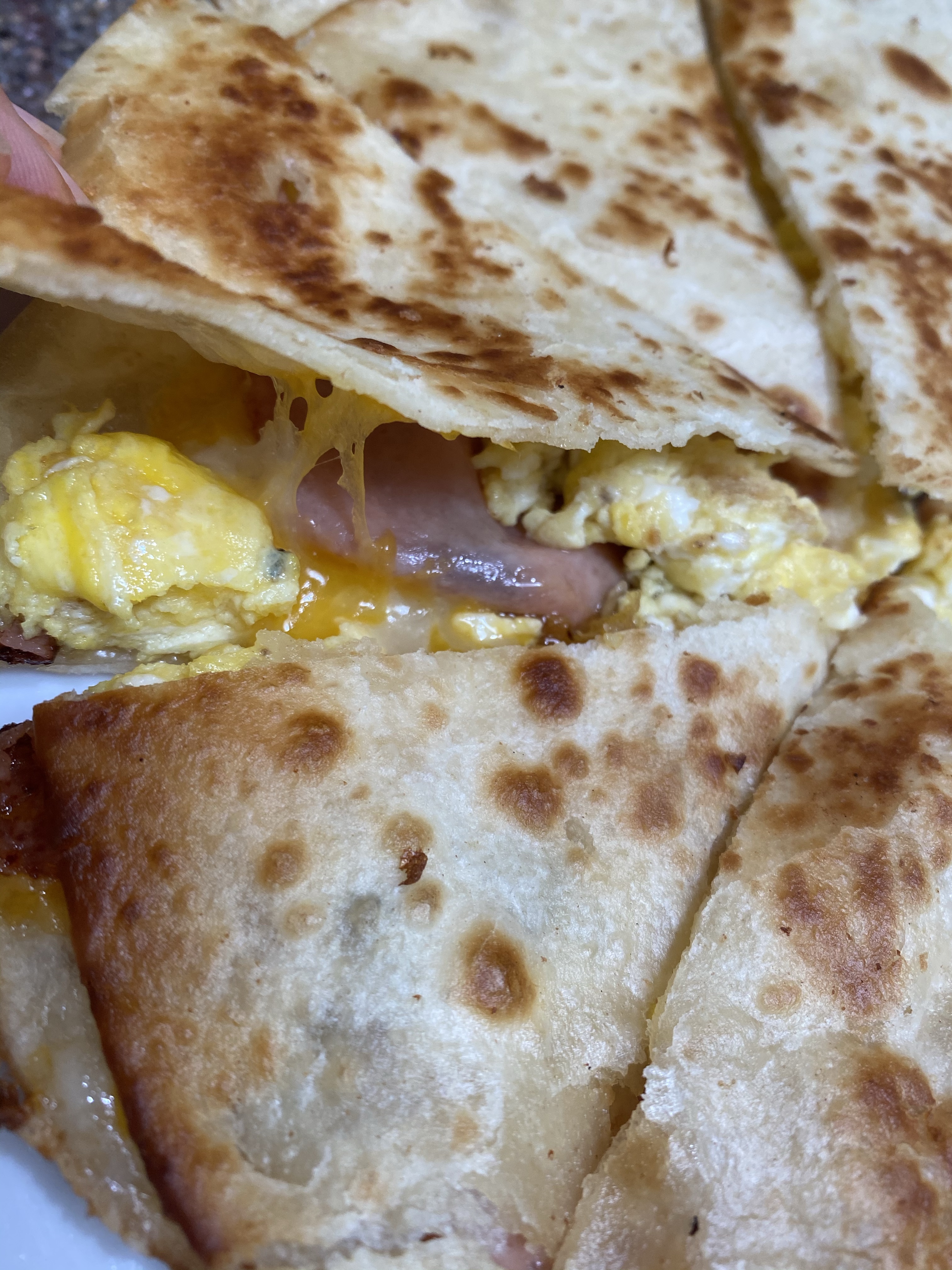 I didn’t participate since I’ve already been trying to bring my freezer inventory down for a couple of reasons. I don’t like having a lot of stuff in the freezer without having a plan for it and I have a freezer repair coming up and will have to take everything out of the freezer for about an hour or so. Plus, since this safer-at-home phase has started, I keep track of the perishables in my kitchen my making a list and trying to use ingredients up without having it go to waste. So — on this morning, I used up some cold cuts, eggs, cheese, and tortillas and made a breakfast quesadilla topped with some salsa I buy from my hairdresser. It was a yummy breakfast! I just fried the cold cuts and scrambled some eggs and put it aside.