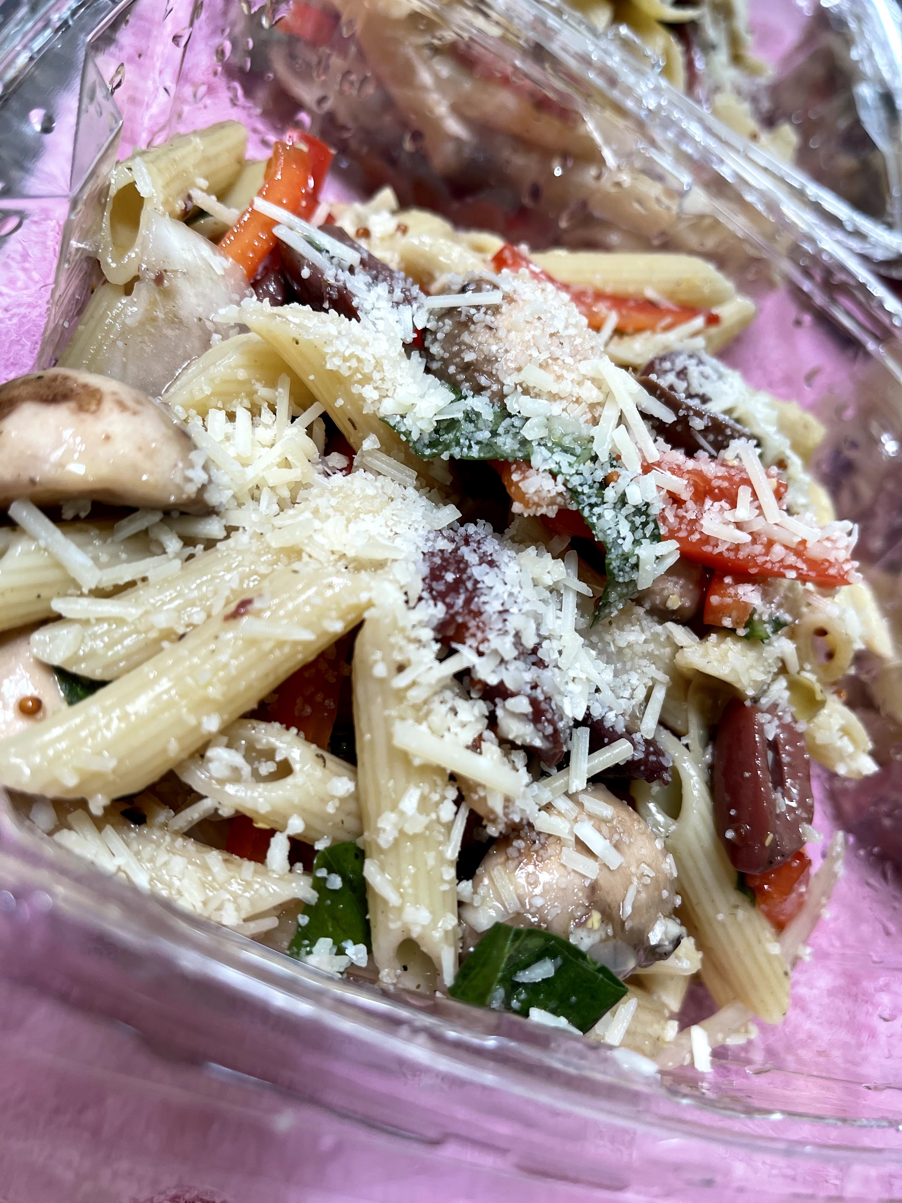 On this day, I added some penne pasta and some sliced salami so that I could serve it as a pasta salad. I sprinkled some Parmesan cheese on the top for extra flavor. And — the green basil and the red peppers give it a holiday feel if you want to make this for a party — next year. But this dish is awesome without the pasta. Just serve it with some crackers or sliced bread. YUM! Living Hilo Style.