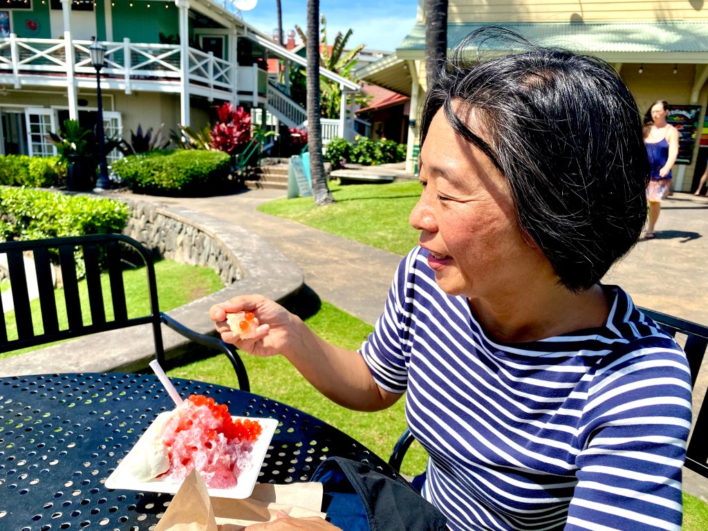 My husband Mark and I got to sample a couple of items from the Artisanal Creations menu. As a fan of the cocktail of the same name, I couldn’t resist trying the Lava Flow – haupia ice cream, Kula strawberry and pineapple syrups, strawberry puree, topped with coconut cream snow cap and a cascade of popping pearls made to look like lava flowing down the side. Mark opted for the Lilikoi Sour with vanilla ice cream, yuzu citrus sour syrup, lilikoi puree, mochi, and li hing mui powder. Both options were beautiful in presentation, delicious, and really hit the spot on a warm Kona day. As an added bonus, there’s a beautiful ocean view from the seating area just above the recently remodeled sand volleyball court. It would be a great place to take in a Kona sunset while enjoying a sweet treat from Gecko Girlz.