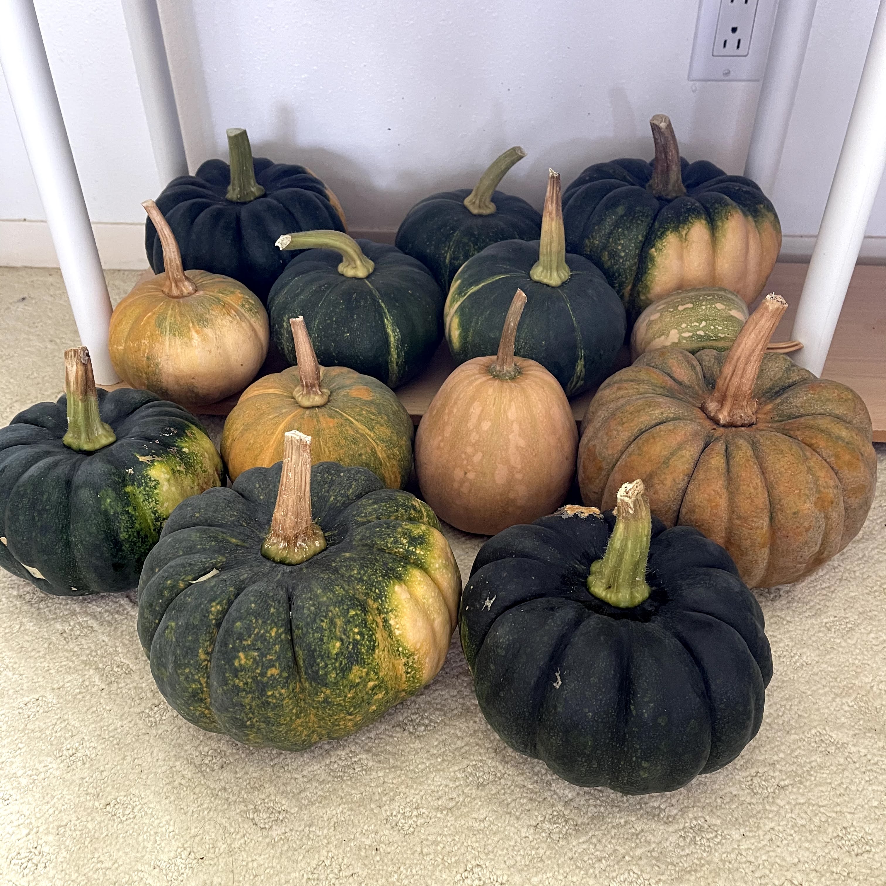 I am still trying to learn how to garden. I have recently found that if I just let my kabocha vines grow, they are happy. I have a bunch of kabocha to eat. We like kabocha roasted with Parmesan, stewed with pinakbet, added to Thai red curry, steamed into a Japanese kabocha salad, and mashed into korokke.