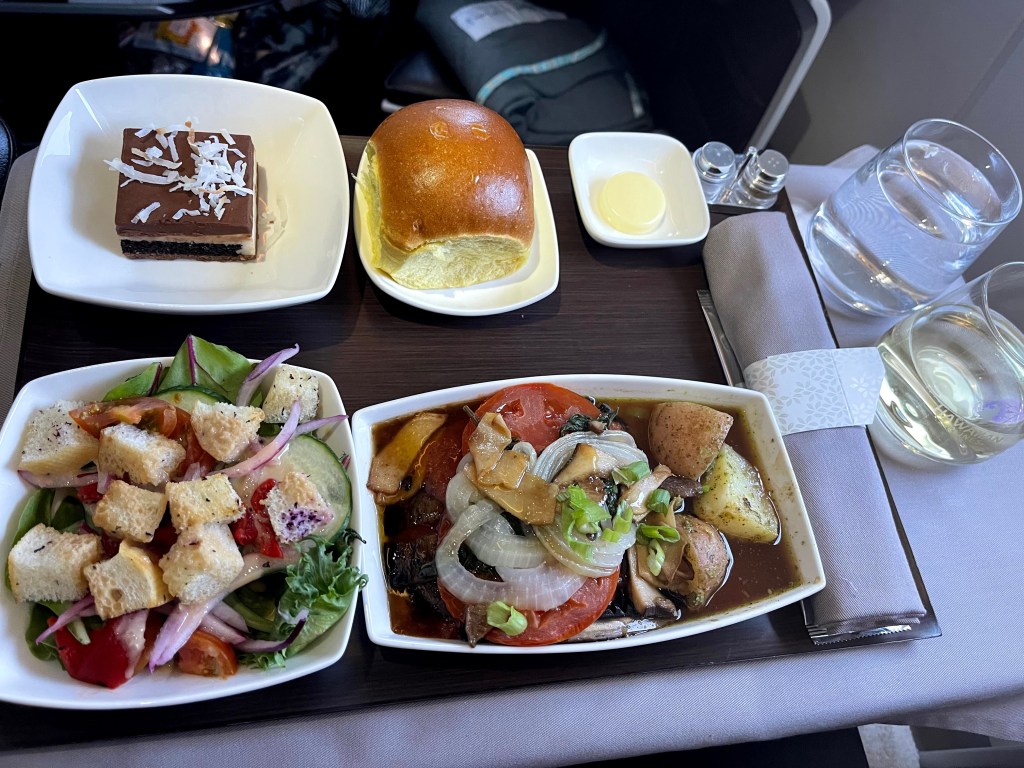 Off to San Francisco! We were comfortable in our upgraded seats and our made-with-love charcuterie box that we snacked on throughout our journey. We also partook of the in-flight Hawaiian Airline meal. The appetizer was a yukari panzanella salad with soy balsamic vinaigrette. The yukari flavor was very mild. I also had the portabello Napoleon with tomato and lilikoi gastrique. The best part of the meal was the dessert—a yummy chocolate haupia crunch cake.