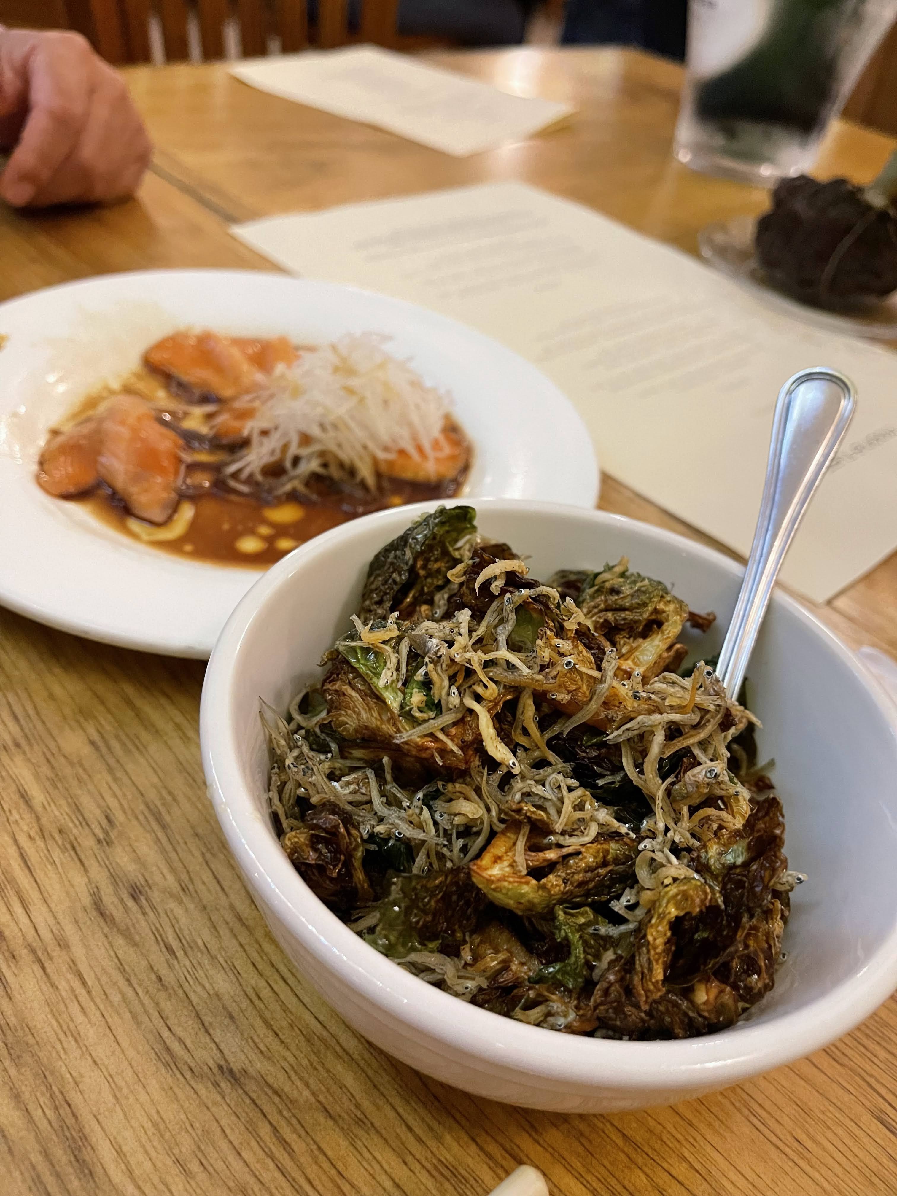 On this evening, I enjoyed Mark’s housemade manapua with Uncle Steven’s smoked meat and caramelized onion. I did like the manapua I was getting from their pop-up takeouts but eating it fresh from the steamer was way better than the takeout! The bread was so soft! They also had their signature Smokey Sashimi and on this night it was made with my favorite Ora King Salmon! My other favorite that I got to enjoy was the Crispy Brussels Sprouts with mom’s fish sauce. (Chef Mark’s mom was dining in too!) My husband loves the mushroom risotto which was on the menu so we got that and the Market Fish which was pan roasted mahimahi cooked to perfection! This was a lot of food for my table of two but Chef Mark recommended we try the Patatas con Pulpo made with a local tako, twice fried potatoes, local mustard greens with an anchovy vinaigrette and olives. I am so glad we ordered it! It was delicious. The tako was so tender and flavorful!
