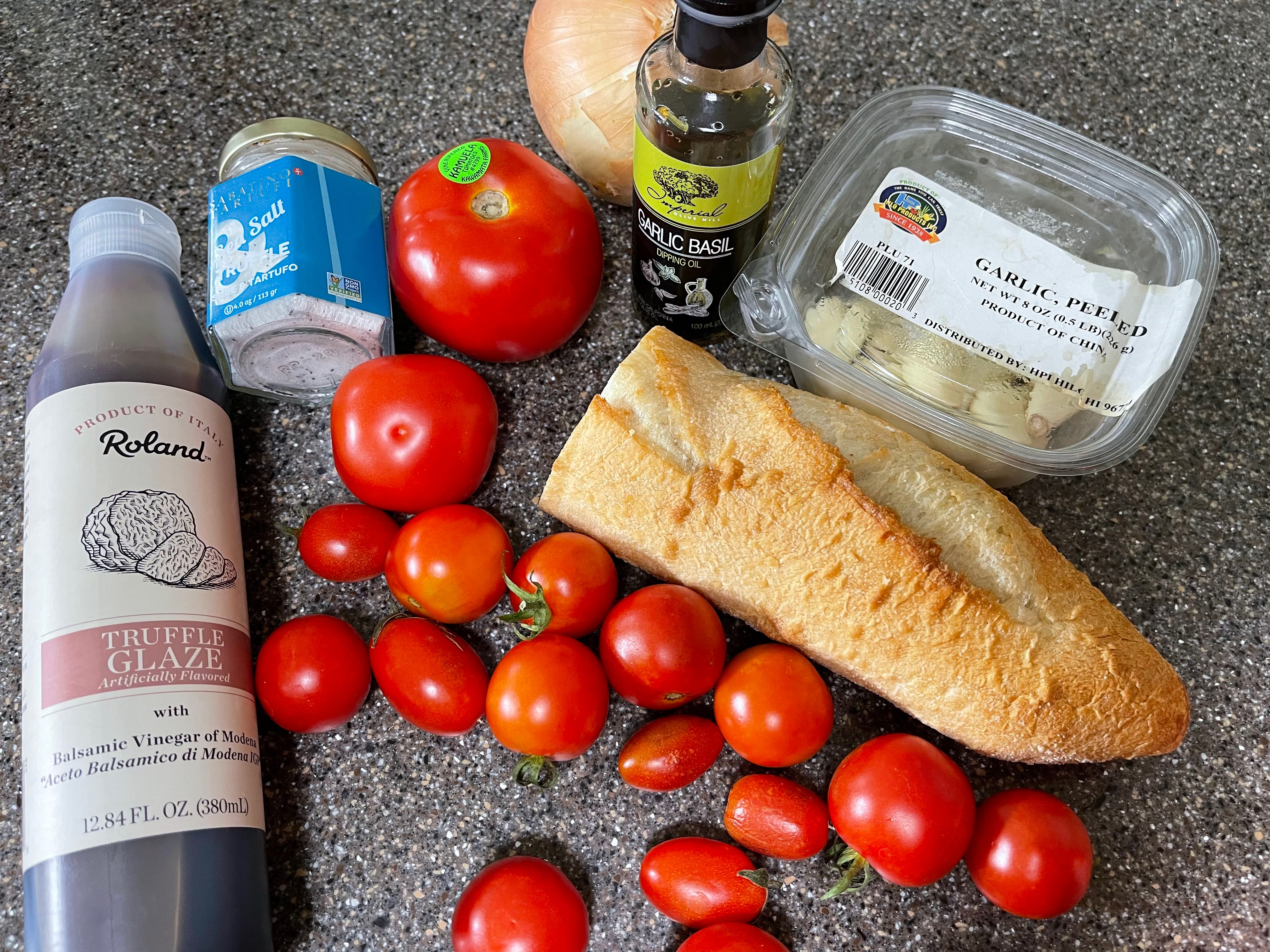 I just chop up some onions, garlic, and tomatoes. I try to remove the seeds from the tomatoes. Put all chopped items in a bowl and mix with salt, pepper, balsamic vinegar, and olive oil. Today, I had some truffle salt and truffle balsamic glaze so I used that. I roast the mixture in the oven at 350 degrees for over 45 minutes so that the flavors intensify and liquid evaporates.
