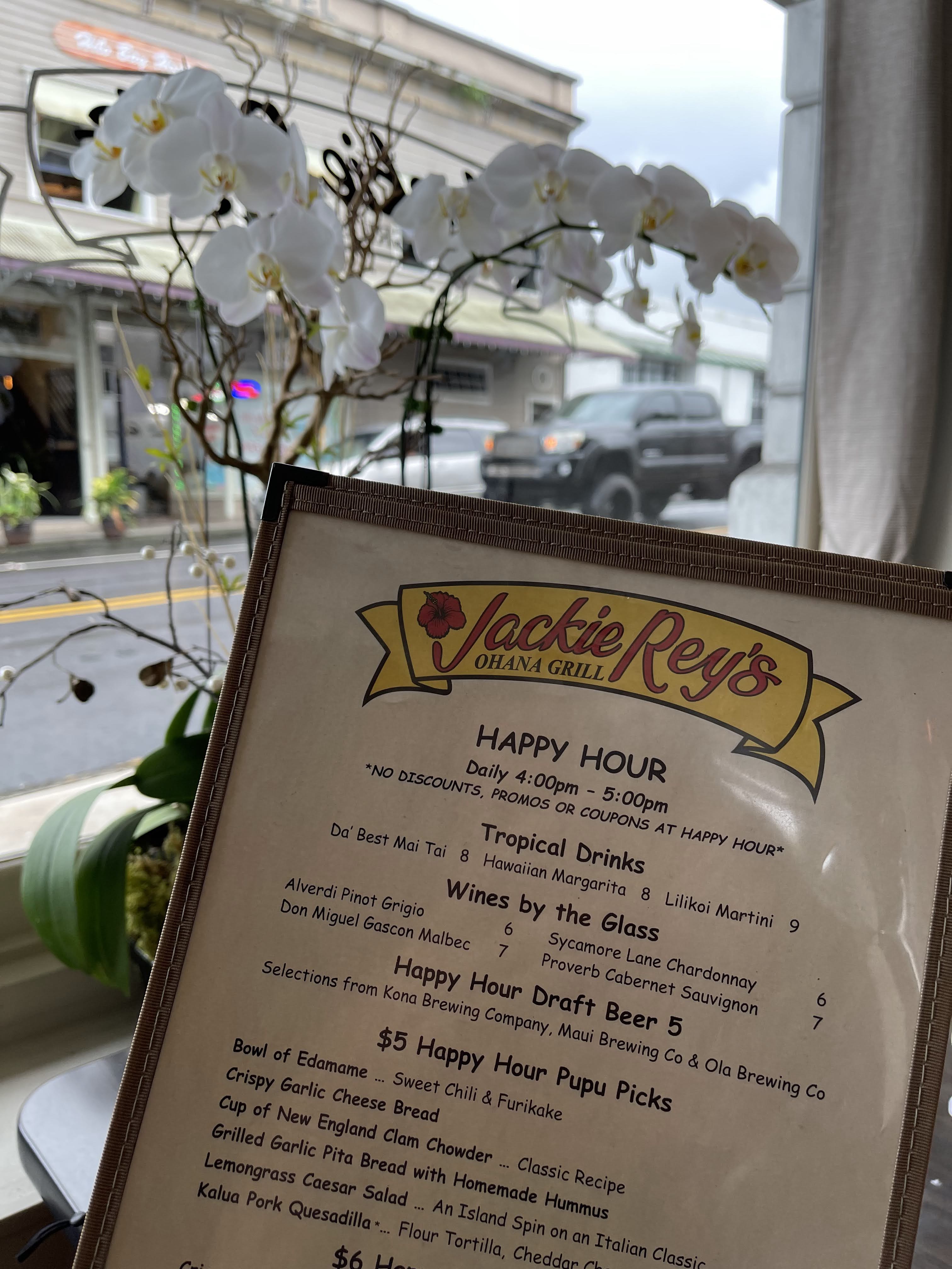 If you’re looking for a happy hour spot in a beautiful space, look no further than Jackie Rey’s in Hilo. I recommend making reservations so you can be sure of getting a seat. It helps if you have a booth with a large table so that you can order a bunch of dishes. We enjoyed edamame with sweet chili sauce and furikake, crispy pork ribs, ahi tartare on wonton chips, Club Med salad, and kalua pork spring rolls.
