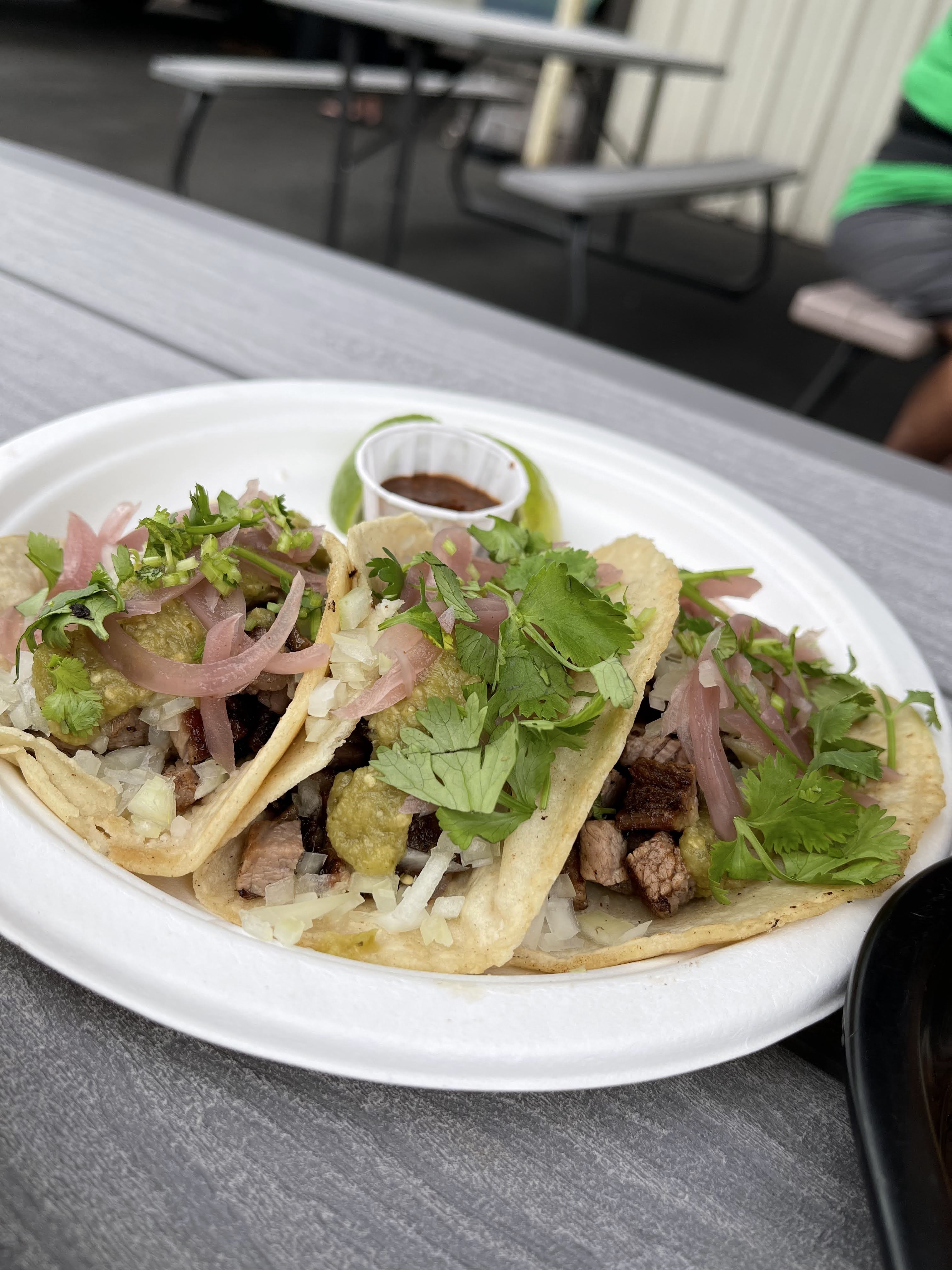 While I was waiting for my order, Jim Barker, a Vietnam Vet who was there with his visiting twin brother and an opera-singing friend chatted with me and shared how much he loves Hilo Brewing Company. I got my beer and then proceeded to get some tacos from the Crusty Buns truck. Since Misty and I both had dinner that evening, we shared the tacos. I thought I was ordering one each of the 3 varieties of tacos, but what I got was 3 tacos all with a mixture of carnitas, tri tip, and sweet potato. I enjoyed the tacos but would be interested in seeing how each one tastes separately.