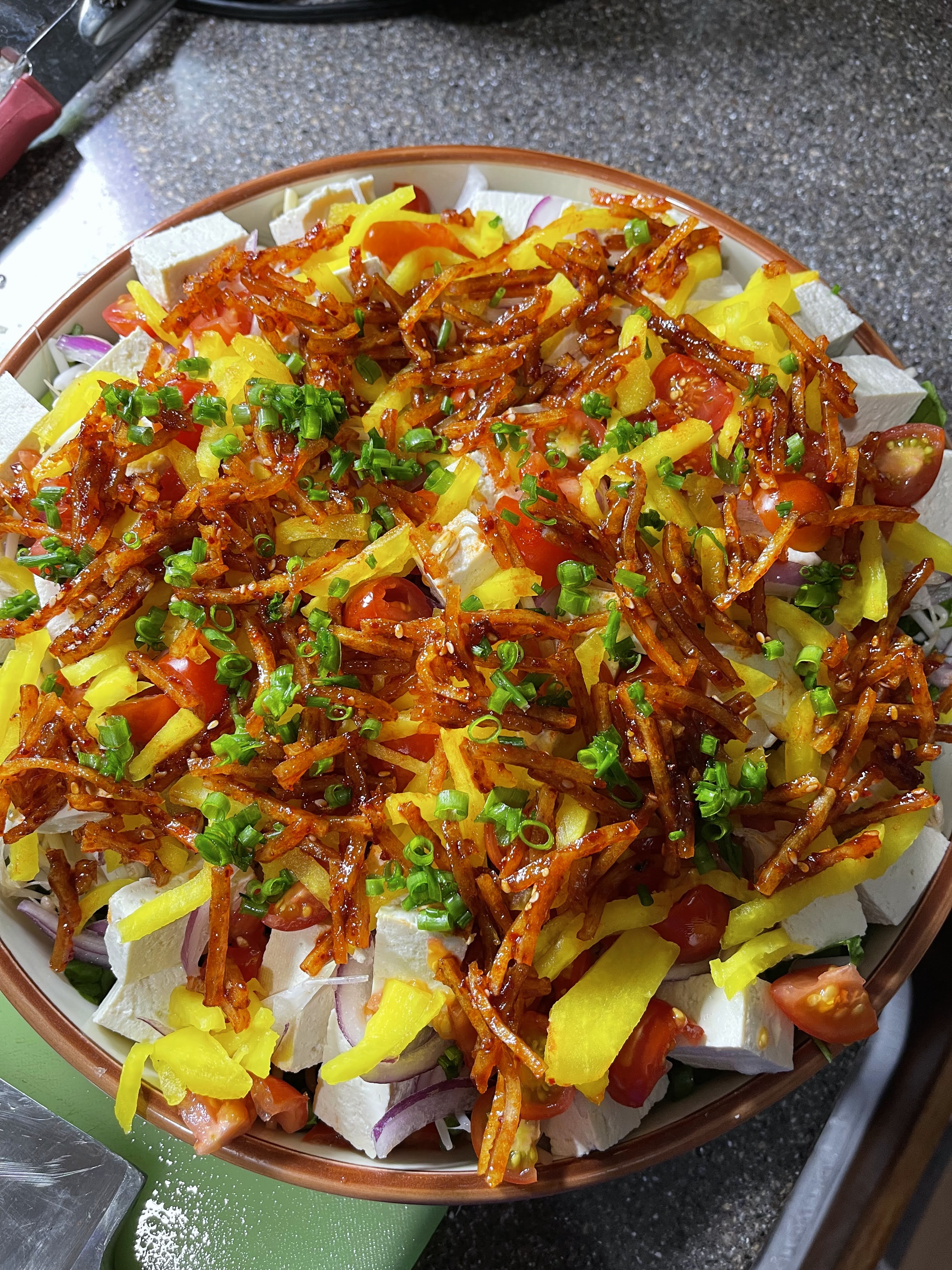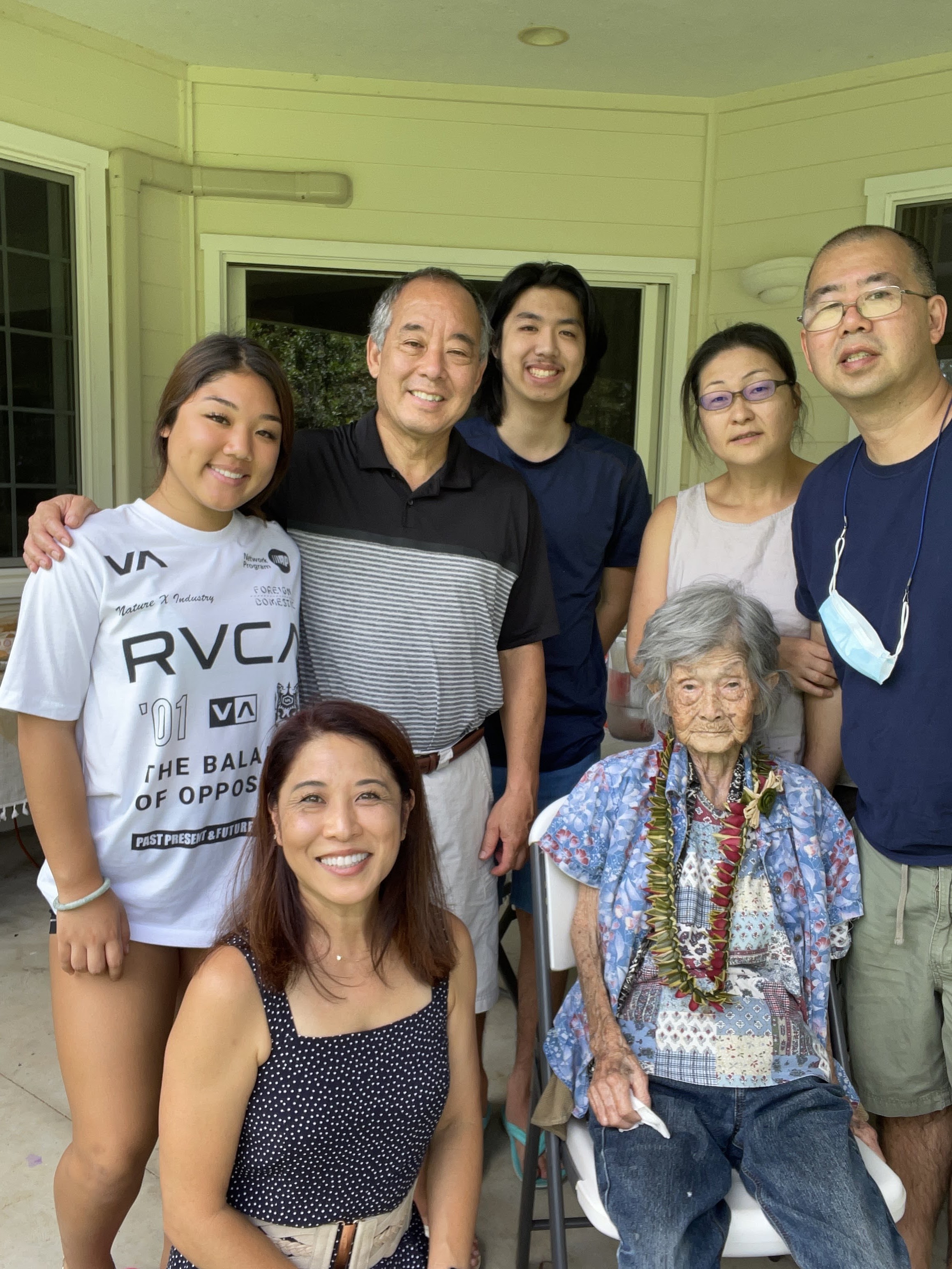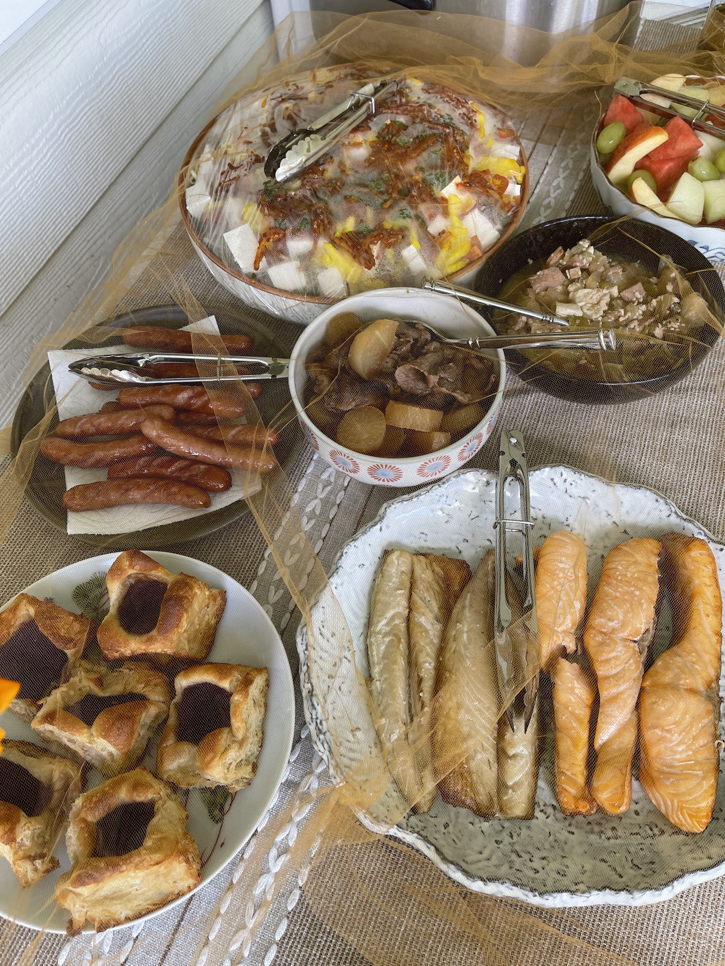 Since there were just seven of us, we had a simple menu. I bought some ube sweet rolls, salmon, boneless saba, arabiki sausage, and assorted cut fruits from KTA. I followed the instructions from Just One Cookbook to make shiozake and salted saba. I just had to fry the arabiki sausage and plate the sweet rolls and fruits. Additionally, I put together one of our favorite salads — taegu tofu watercress salad with ingredients all from KTA too. I also put out a couple of bowls of leftovers that included thinly sliced beef simmered with daikon and a hechima/nabera and tofu with spam in miso sauce. These were all very easy dishes to make that I could cook inside and bring outside. My sister-in-law made a delicious tamagoyaki and also brought desserts from Short and Sweet. POG mimosas were refreshing and made our brunch feel special on this Sunday morning. We even found a beautiful orchid at KTA that served as our table centerpiece and gift for my mother-in-law. Living Hilo Style.