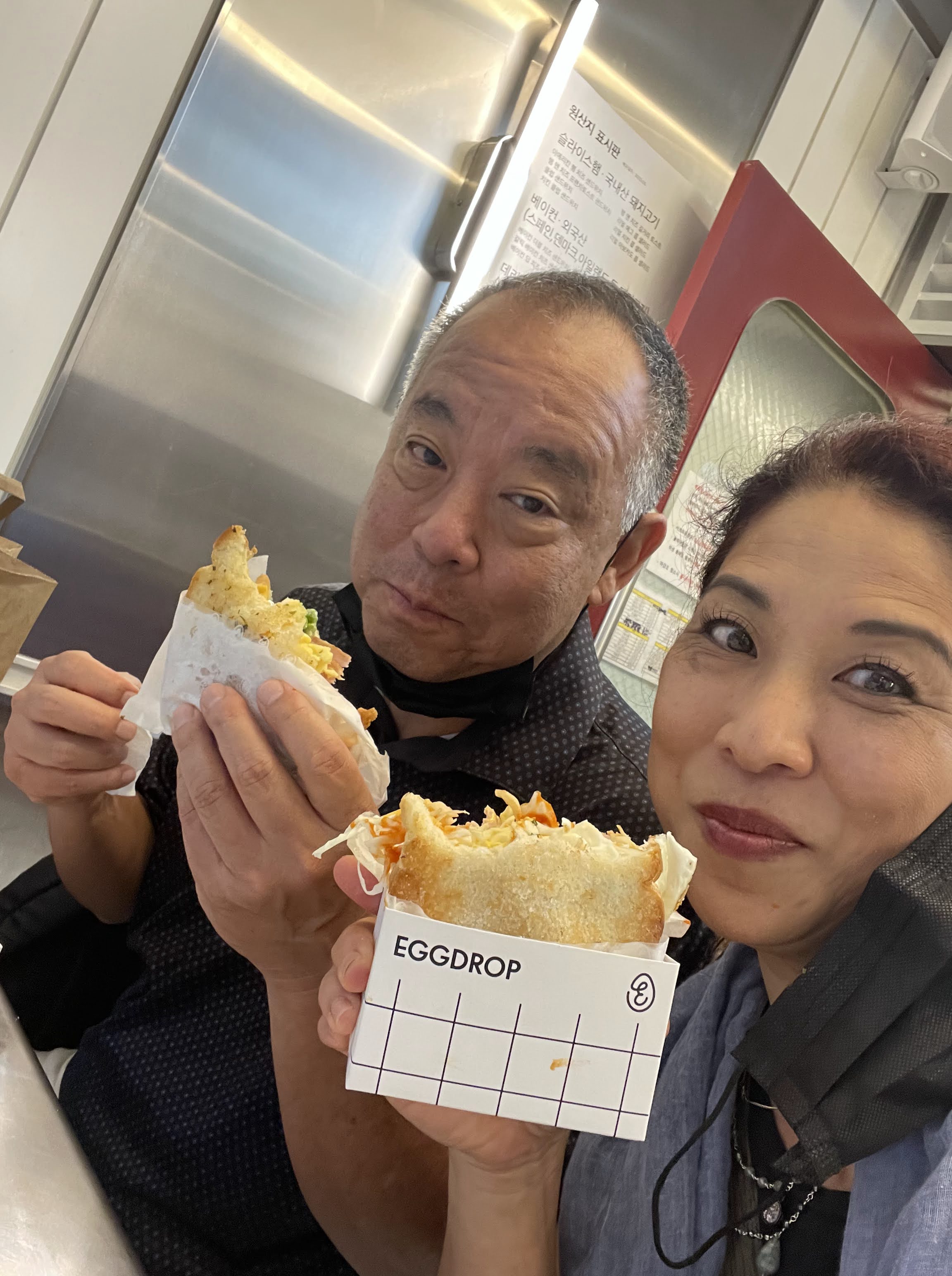 I thought I’d be waking up a little later by now but I still woke up at 4:30 am. I looked up places to get breakfast in Hongdae and found an Egg Drop (Korean egg sandwich) location just a 5 min walk away from our hotel. I had a yummy ham and cheese and my husband loved his garlic with bacon and cheese.