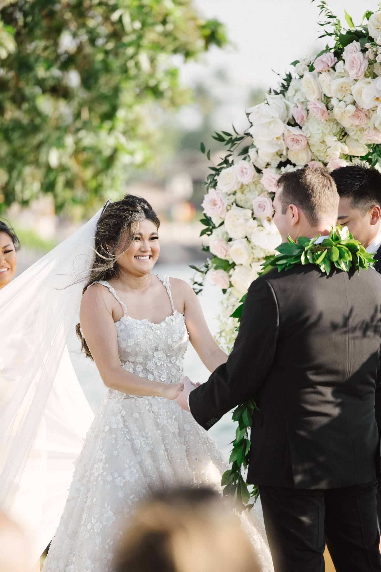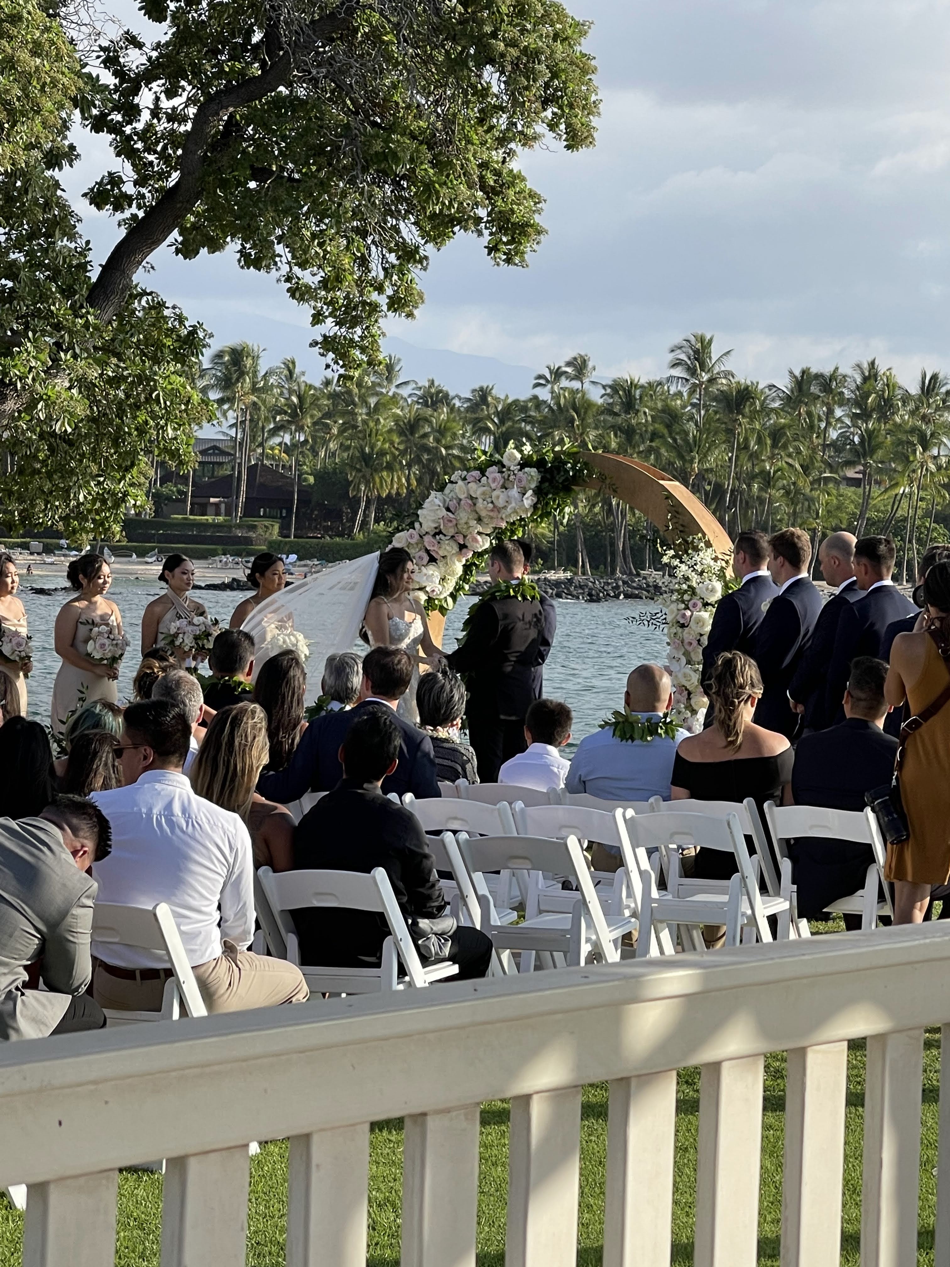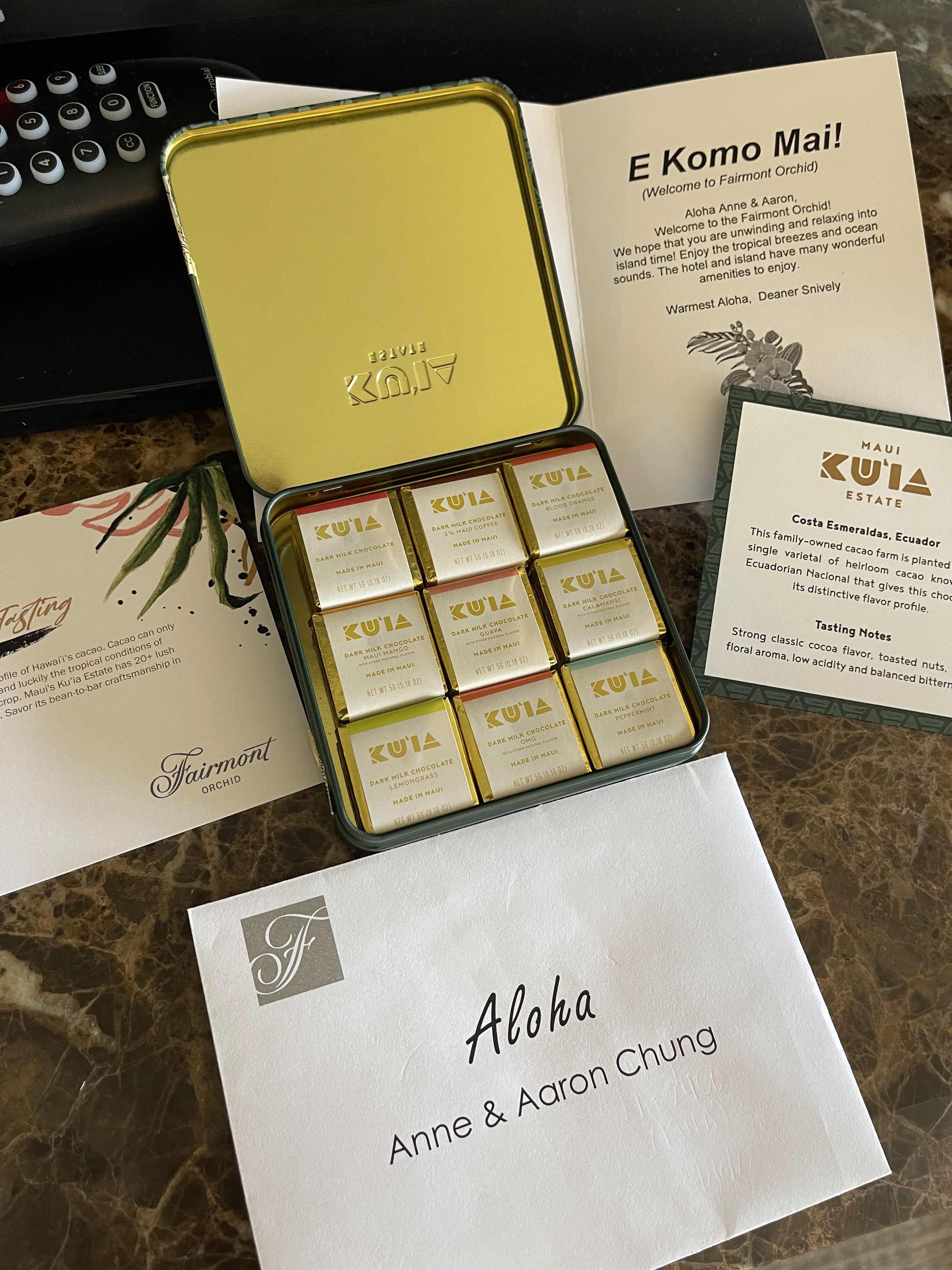 I was invited to join in a fabulous wedding weekend. At my age, I don’t receive too many wedding invitations and so this one to Kayla and Lou’s wedding felt very special. We checked in at the Fairmont Orchid on a Friday afternoon where I found an awesome Ku’ia chocolate welcome surprise from Deaner waiting for me in the room! We quickly got ready and headed to Naomi’s suite where we caught up with friends with day-before-the-wedding pre-party champagne. After enjoying some bubbles, we were picked up in chartered buses from which we saw a beautiful rainbow on our way to the beautiful Kohanaiki property.