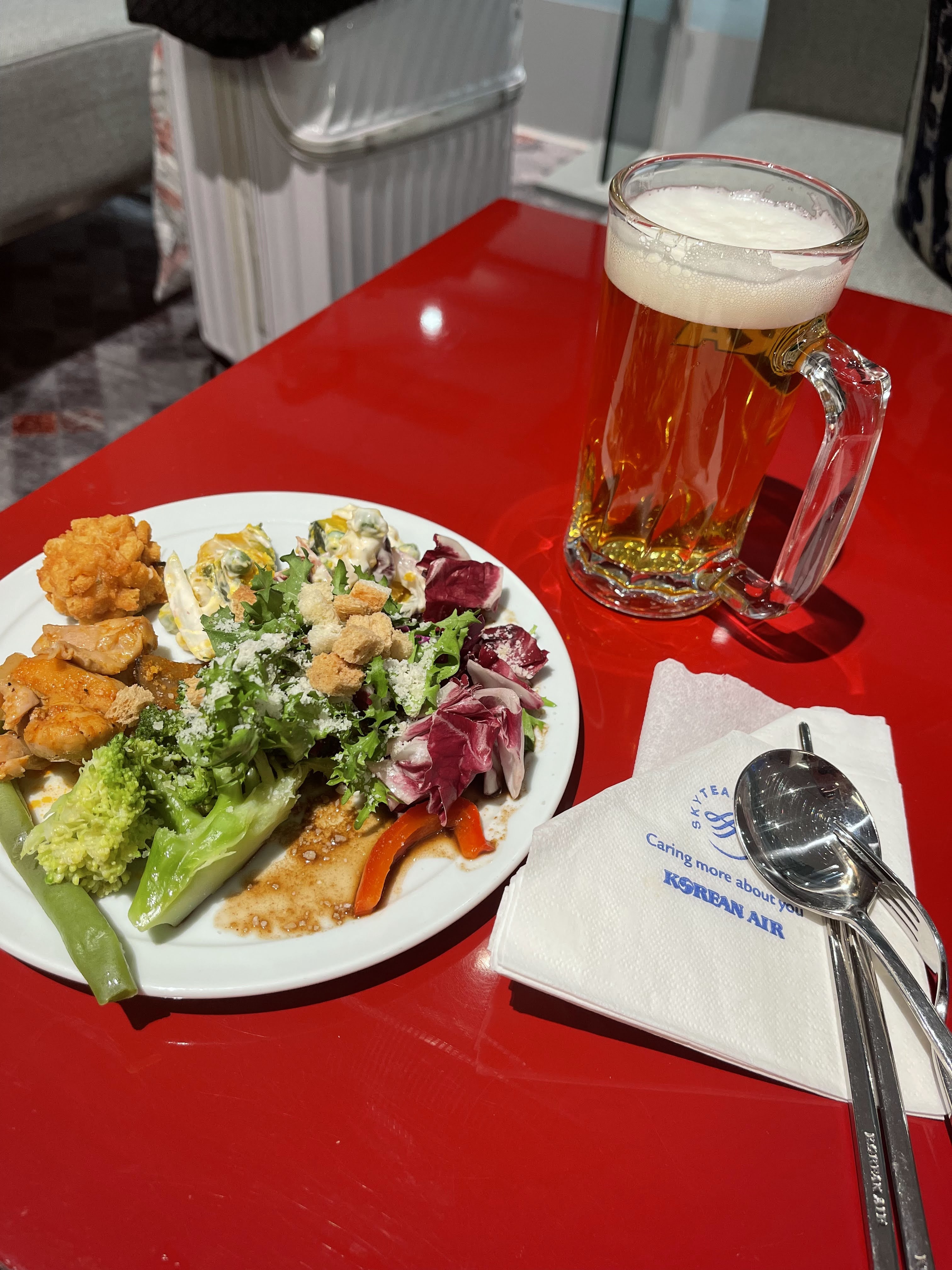 A friend and I planned a quick trip to Seoul for the weekend. The weather report indicated that there was snow the day before we arrived and chilly weather was forecasted while we are there. I packed my scarves, hats, and gloves and carried on my coat and wore my boots and headed to ITO. After solving a forgotten phone hiccup, my friend and I made it on our plane from ITO to HNL. The flight was slightly delayed due to some bags still needing to be loaded on the plane. Our flight from HNL to ICN was also slightly delayed but we settled in our upgraded seats and relaxed on our 11 hour flight to Incheon. I watched finally watched the Disney + version of Hamilton and thoroughly enjoyed it and want to know more about A. Ham and A. Burr and everything about Eliza.