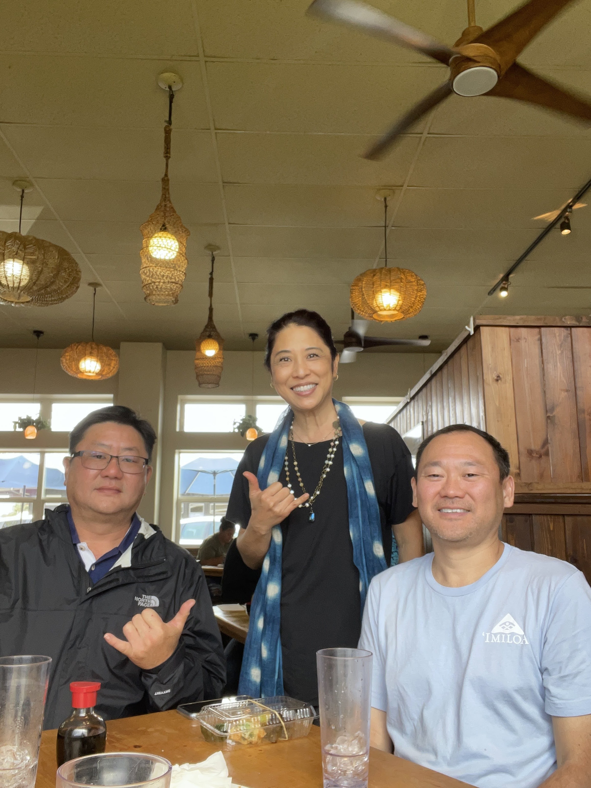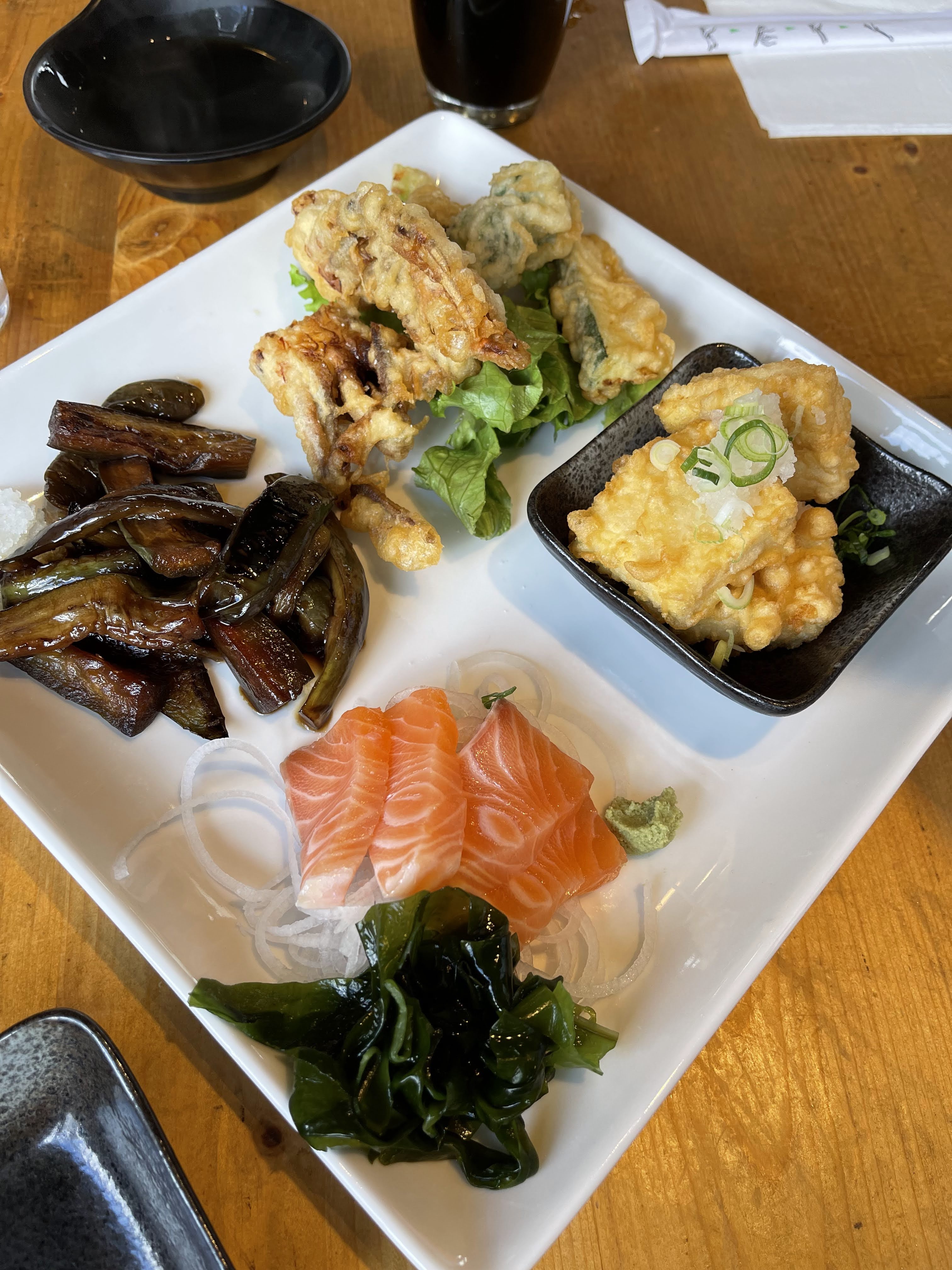 Kurt visited us in Hilo again and luckily we could get together for lunch at Miyo’s. We had reservations for 11 a.m. when they opened and were seated quickly when we got there. Our table ordered the appetizer sampler which was an awesome plate of soft-shell crab tempura, fried tofu, salmon sashimi, and sauteed eggplant. For my meal, since I had gone recently and enjoyed the saba entree last time, this time I went with Combo G which my friend Misty says stands for GREAT.