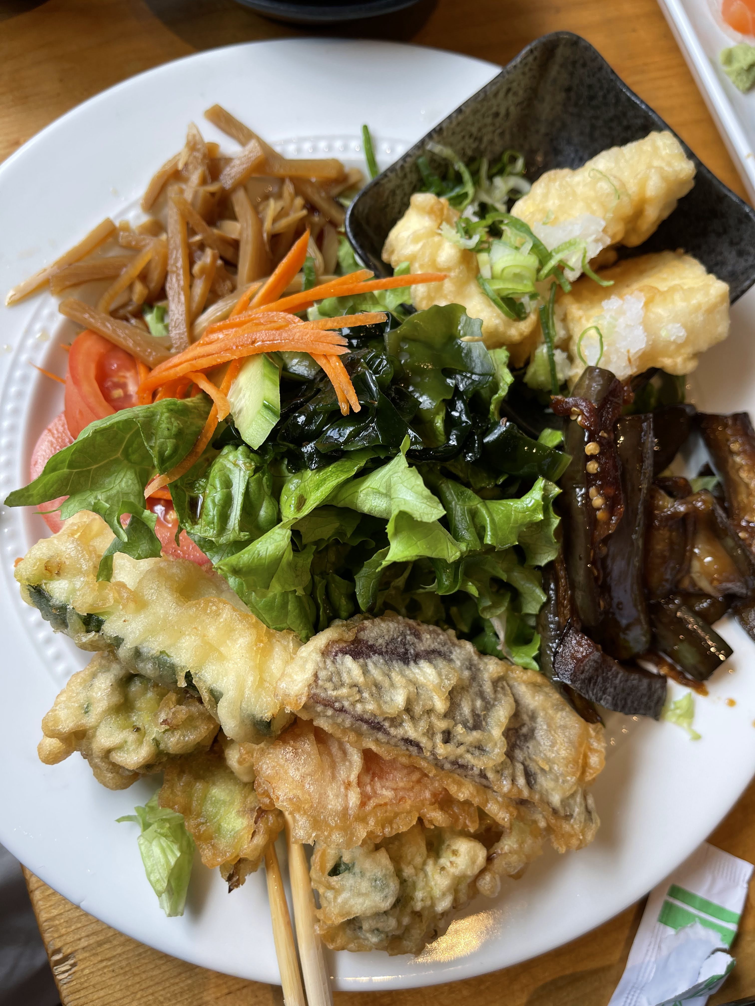 In addition to rice, miso soup, and salad, this combo comes with vegetable tempura, a choice of cold or fried tofu, and sauteed eggplant. I never make tempura at home so I like ordering this when I eat out. I LOVE their sauteed eggplant and can just eat that and rice for a meal. I am trying to eat more veggies so it is great to have a fresh green salad as a big part of lunch. The meal sounds kind of light but I had to ask for a takeout container because I couldn’t finish everything. But maybe that was because I enjoyed the appetizer and all of my friend’s sweet potato tempura. Living Hilo Style.