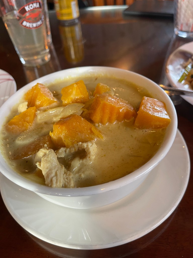 One of my friends is allergic to seafood and the restaurant was really good about informing us which dishes had fish sauce or shrimp paste in them or modified the dishes to not include it. We ordered Yellow Pumpkin Curry, Eggplant and Tofu dish flash-fried with black shoyu, garlic, carrots, and Thai basil, and a Chicken Cashew dish stir-fried with carrots, zucchini, broccoli, onions, green beans, celery, mushrooms, and garlic. These dishes went well with my cold Singha in a frosted glass. I really liked the eggplant dish. Ask for some chili sauce to go with it to up the flavors.