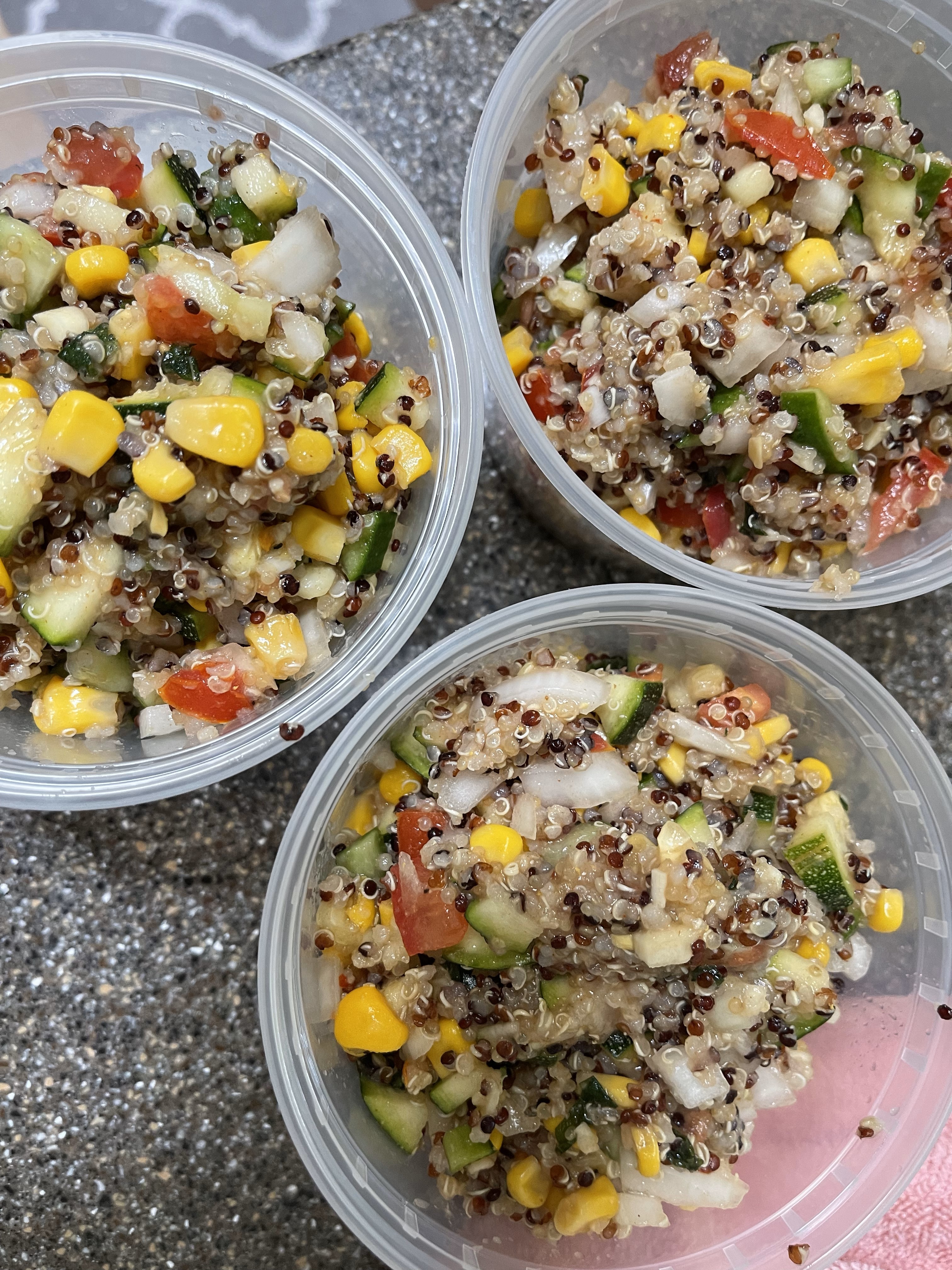 Our work meetings these days are more often in person than virtual, and it is way more enjoyable if there is food involved. On this day, I brought a chilled quinoa salad that I thought would be refreshing during these humid summer days. I thought it was a perfect light and healthy snack to keep us fueled for our meeting.