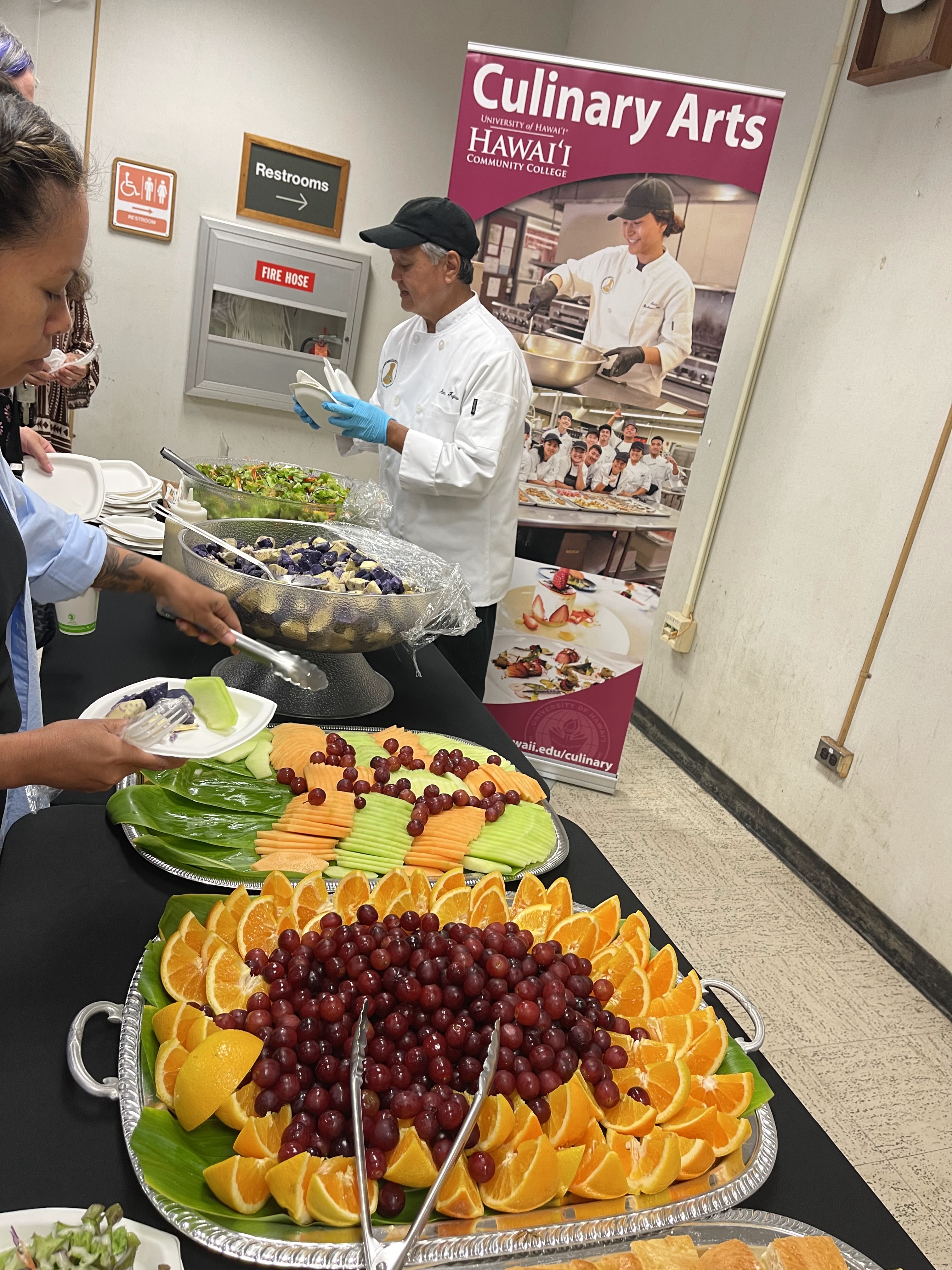 The school year is starting soon at Hawaii Community College. All employees are back on campus and we were welcomed back with a breakfast buffet that included salad, fruits, yogurt, granola, sweet potato, ‘ulu, rolls, rice, scrambled eggs, pork links, and Portuguese sausage.