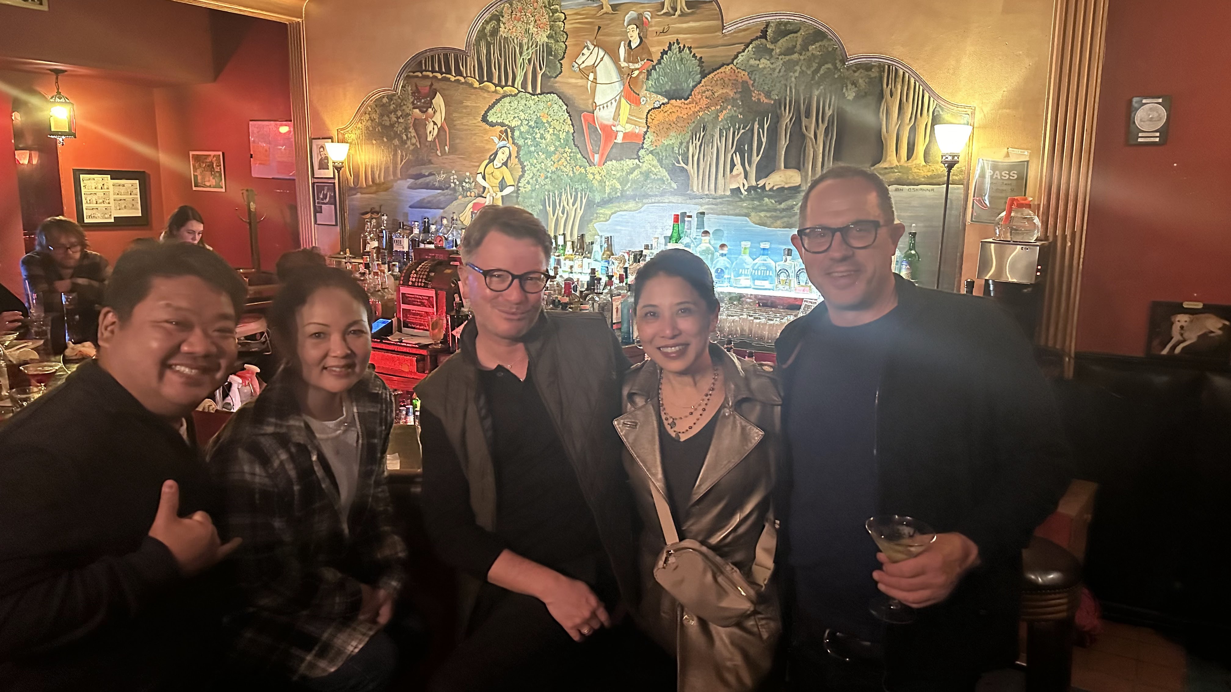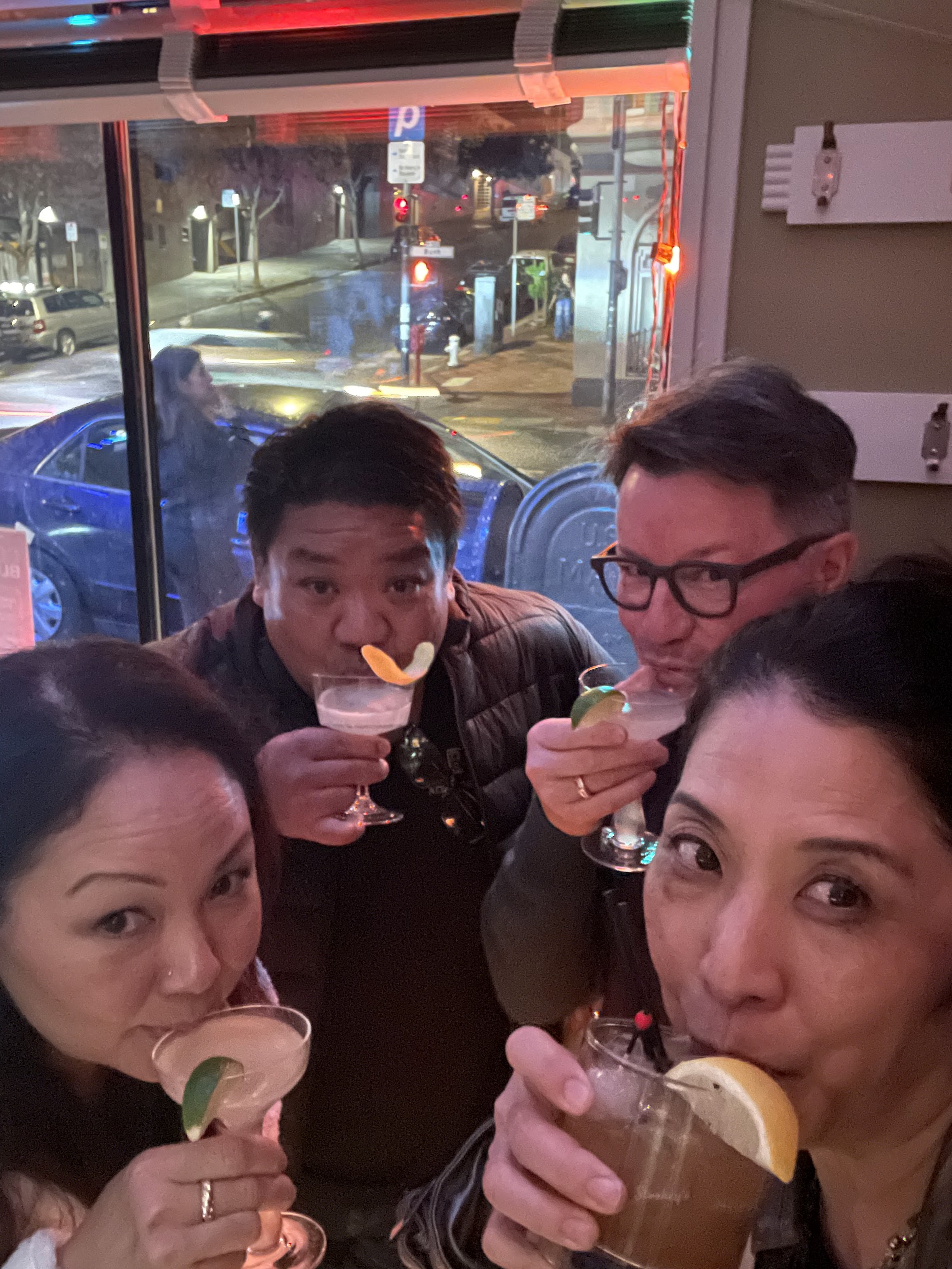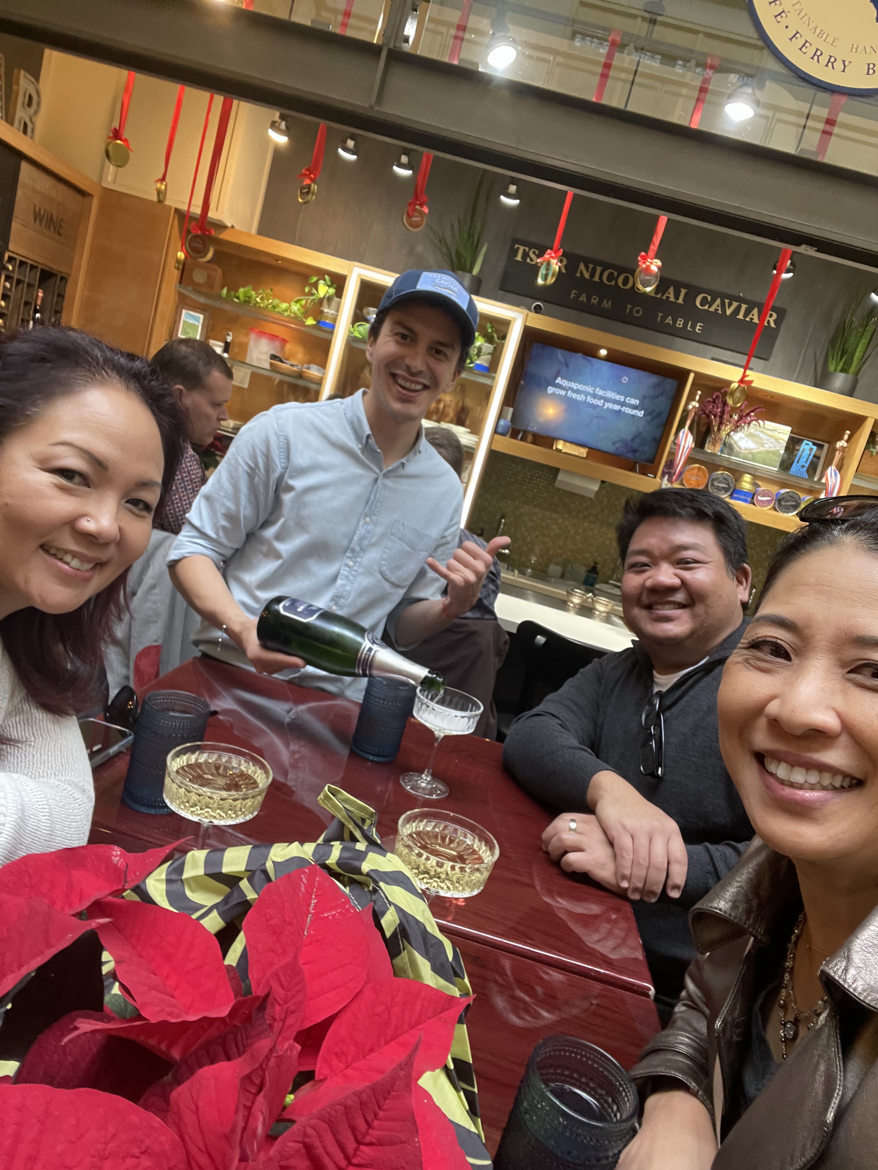 Marla smartly shut the blackout curtains so that I would wake up with the sun and start Ryan on the Anne and Marla SF tour too early. Our first stop was to the Ferry Building Farmer’s Market. I had intended for us to walk the mile there but it was rainy so we ended up hiring an Uber. After exploring the market, we stopped Hog Island Oyster Company for some oysters, champagne, and chowder. After lunch, we explored the shops inside the building before visiting my pal Moises at Tsar Nicolai for caviar and more champagne. We also purchased more caviar and accouterments to take to Deaner’s home that evening. We also picked up some Alfajores shortbread, dulce de leche cookies from a local vendor for our dessert that evening. Since the weather cleared up, much to the chagrin of my travel mates, I suggested that we walk back to the hotel where on the way, I made a quick stop at Saks before stopping in at the Westin St. Francis to visit Russ at the Chateau Montelena tasting room. Next stop on this Saturday—Deaner’s house in a neighborhood that was beautifully decorated for the holidays. We enjoyed amazing pasta and homemade meatballs where Deaner’s hospitality was on full display. At close to midnight, we decided it would be fun to head to Zam Zam in Haight for a nightcap. Check out Zam Zam for some cool history. I wish I could ask the amazing mural to tell me the stories of what it had seen over all the years of being on display. Also—you won’t get a napkin unless you request one. You can find out why if you go there.