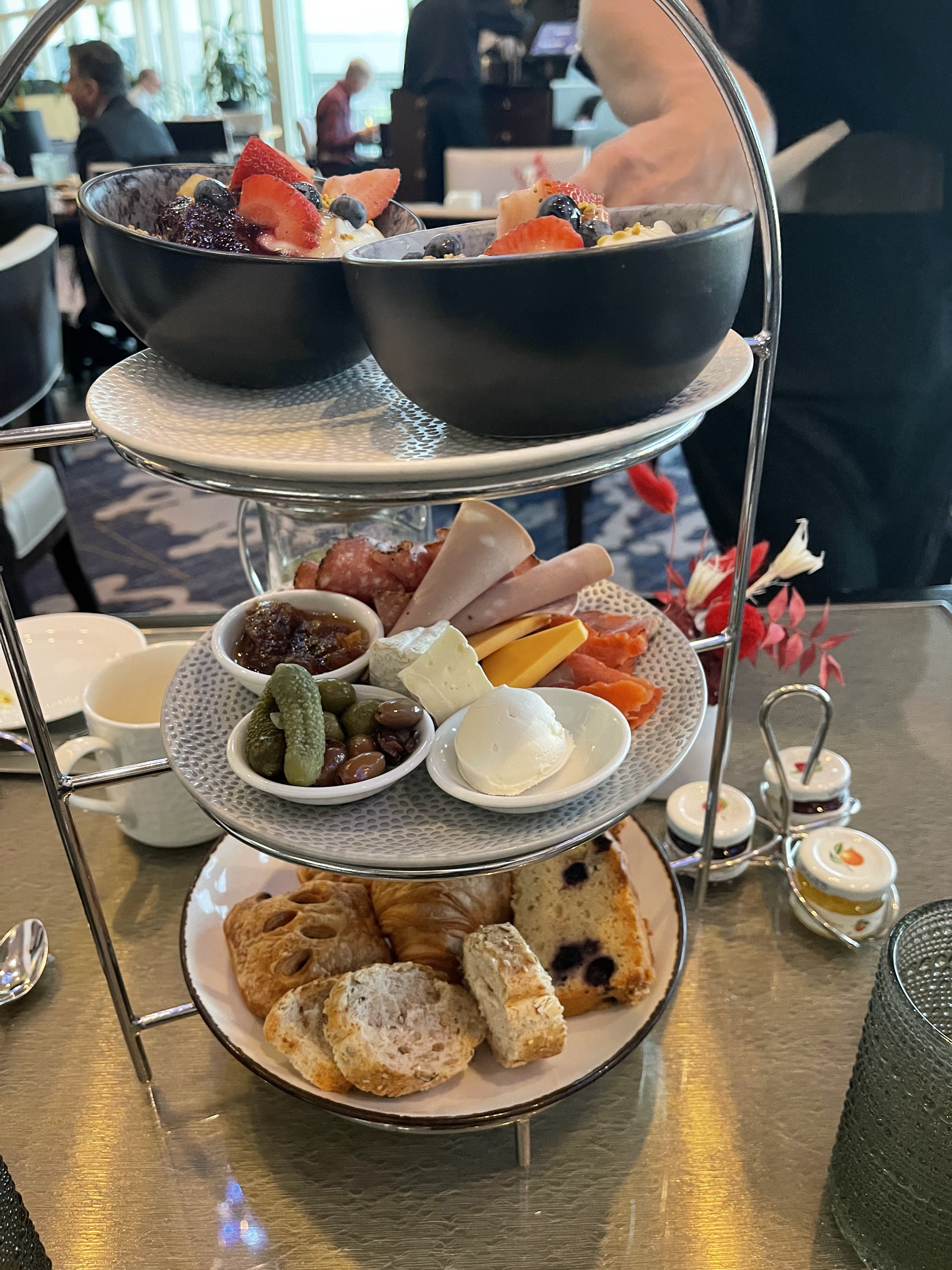 After bringing our bags to the room, we explored Vancouver. The city really embraced Taylor Swift. There were lighted signs, decorations, and special menu items all over the city! We started our exploration of Vancouver by taking a pic with the LOVER sign near our hotel. Next, we headed to the merch shop at the cruise ship terminal. The wait was only 1 hour and 20 minutes, not the 3-4 hours we expected. After getting our merch, we walked toward the Westin to either get in that merch line or find lunch. Along the way, we found the SWIFTCOUVER sign and got a photo there. We found the merch line at the Westin Bayshore but that line was too long!!! The shop wasn’t open yet and there were people who were already waiting in the line for over 2 hours. We gave up on more merch and decided to have lunch at the Tasting Room at the Westin. It was great to take the time to sit and relax. After lunch, we made it to East Bay Beach Park where we found the happy smiling statues. The statues were decorated with Swiftie beads which made us smile too. We also got to take a pic with the CARDIGAN sign. Next, Jill and I had happy hour at Earls Kitchen where we enjoyed some cocktails and local wine. The rest of the group came for dinner a couple of hours later.