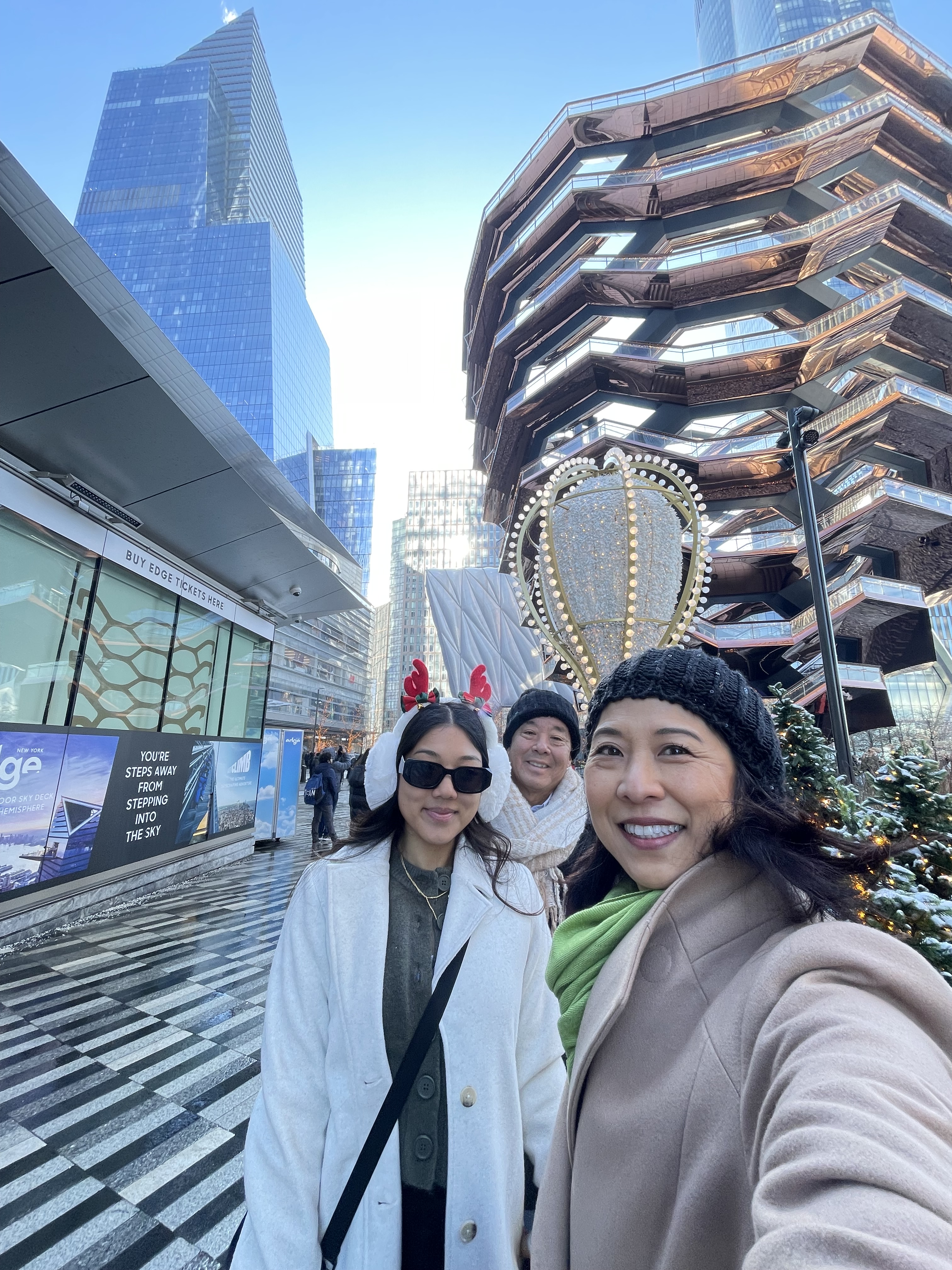 On day 6, our friends left and our daughter joined us. Upon her arrival, we showed her around Bryant Park which is conveniently just a block away from the Knickerbocker. Next, we had reservations at the Miracle on 9th Street Christmas pop-up bar. After our cute Christmas drinks, we headed uptown to Central Park and visited the Bethesda Fountain. My daughter shopped at the Columbus Circle Shops while I went to the Lincoln Center TKTS booth. I secured seats for the Harry Potter show on Broadway. But first, we took Sammie to Los Tacos No. 1 before the show. If you love the HP series, you’ll love the show. Aaron and I had seen it before but had forgotten that it wasn’t a musical. After the show, we stopped at one of the Halal food trucks near the hotel. Sammie got to help prep the order in the truck! I think she counted that as her favorite experience of the trip. Plus, we got snow flurries today!