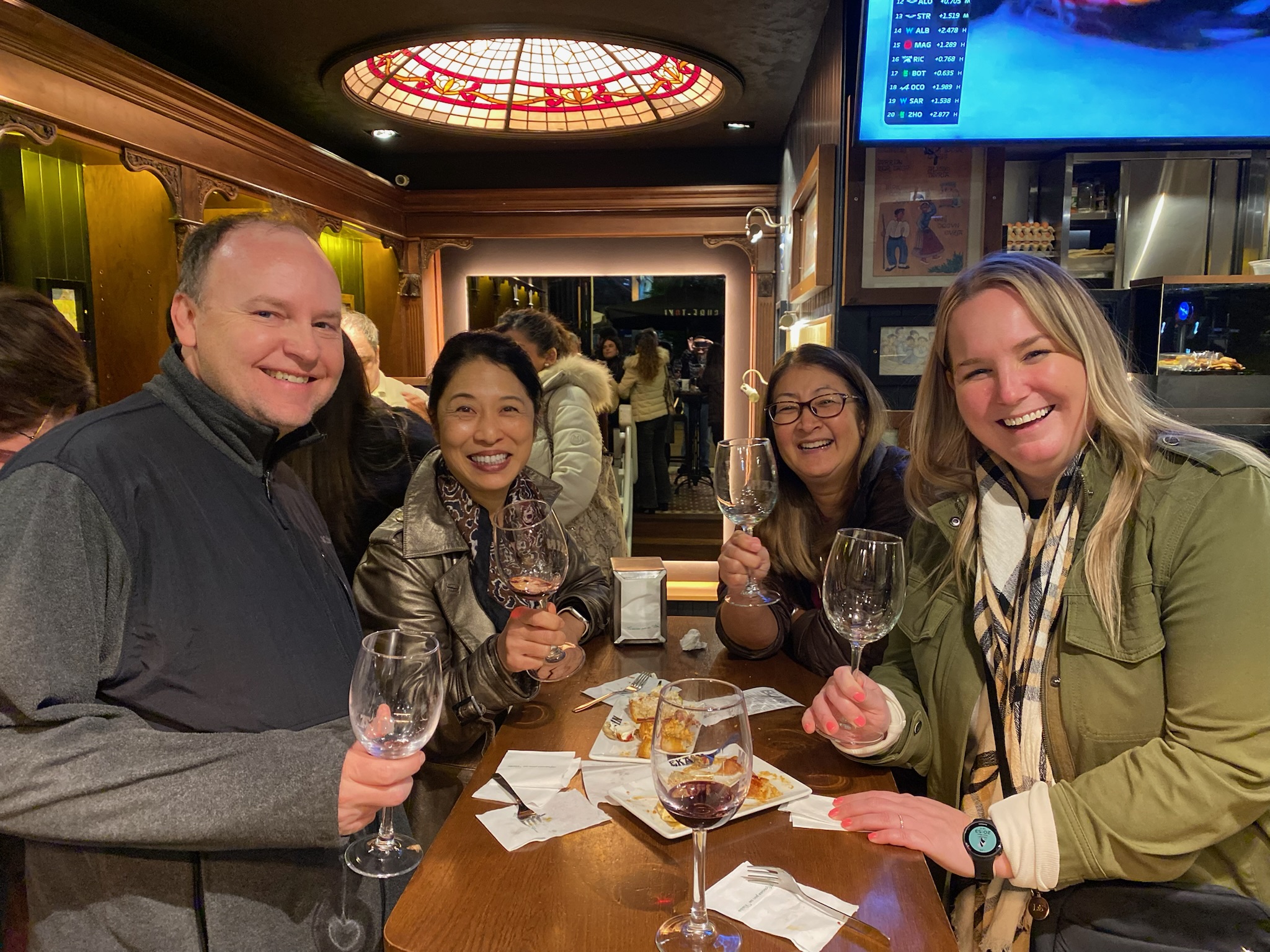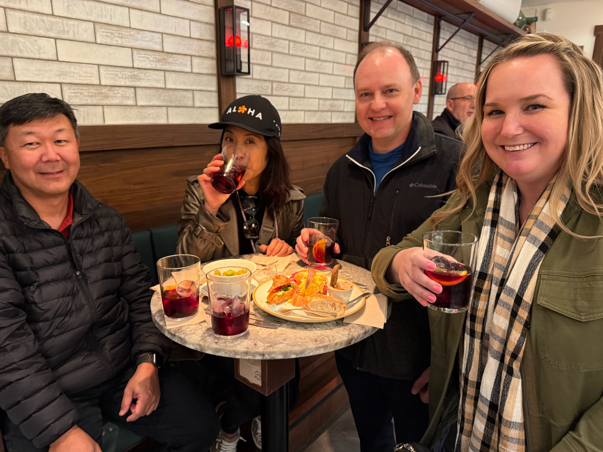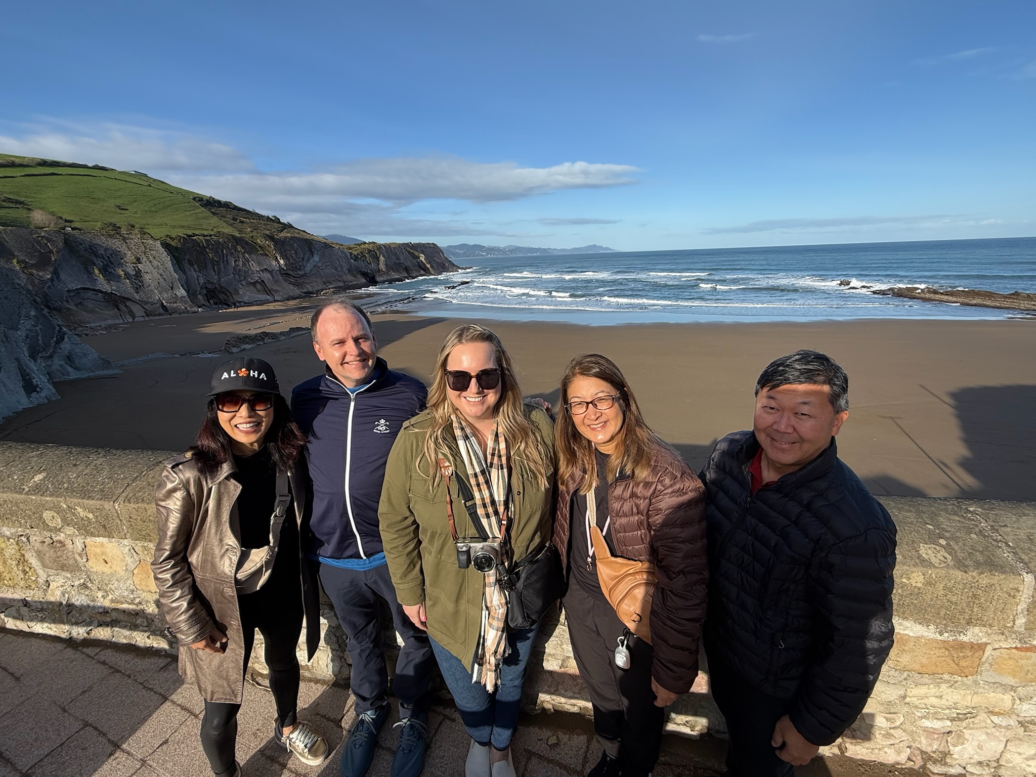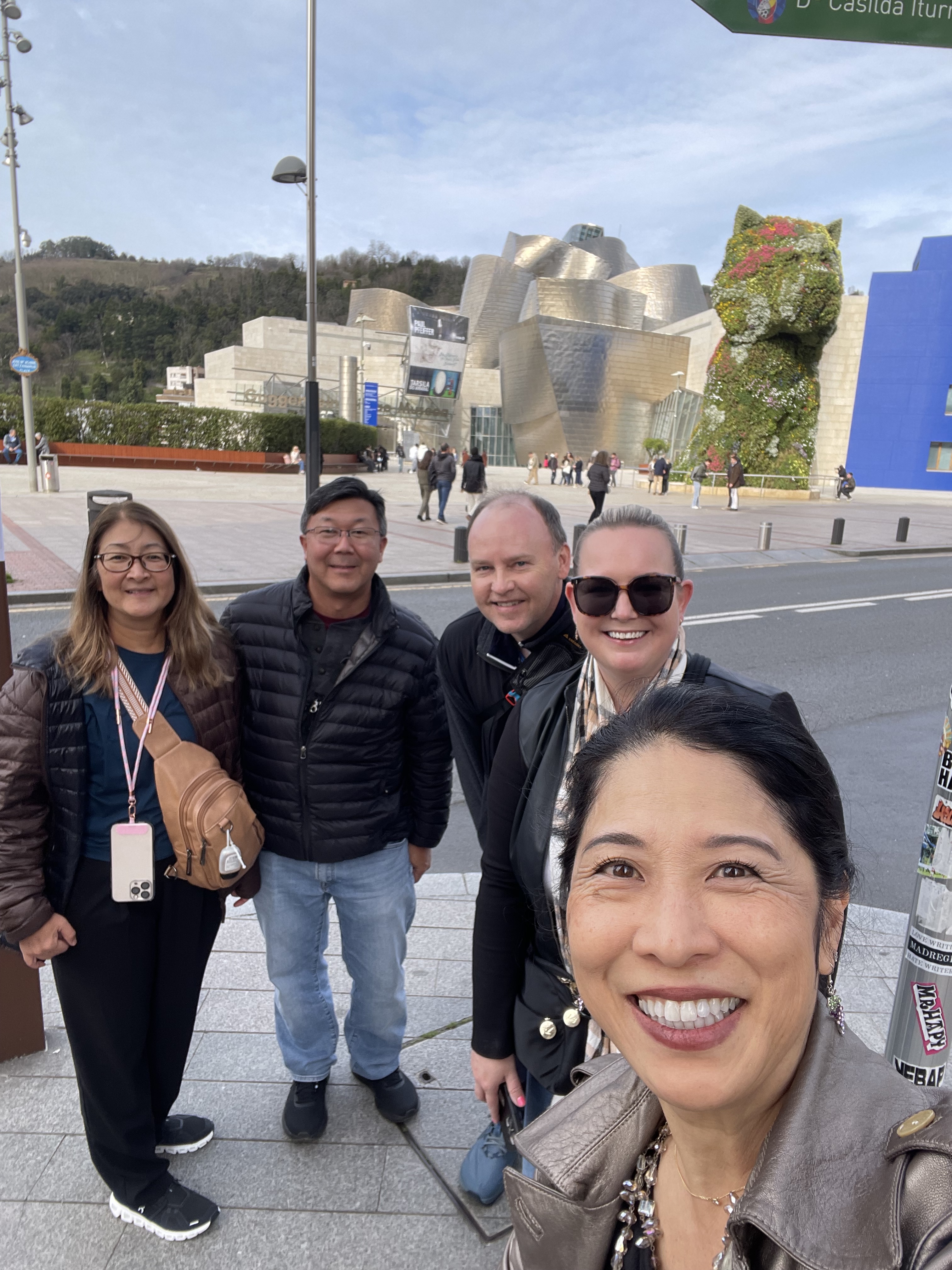 On our second day in Spain, I still woke up at 3:30 a.m. We visited Bertiz for breakfast where I got an avocado toast and a Basque tart for only 5 euros. We explored Bilbao on foot and found Bascake where we had the famous Basque cheesecake. It was deliciously soft and silky. It was sweet but not overly so. We found more pintxos for lunch. Then, we headed to the Guggenheim Museum and admired the building from the outside and the exhibits inside. After our art stop, we walked across a bridge and headed to Gastronomia, our site for our cooking class. We learned to prepare a few pintxos and tapas dishes. We enjoyed preparing new dishes while learning about Basque culture and ingredients while sampling Basque wine and a floral gin.