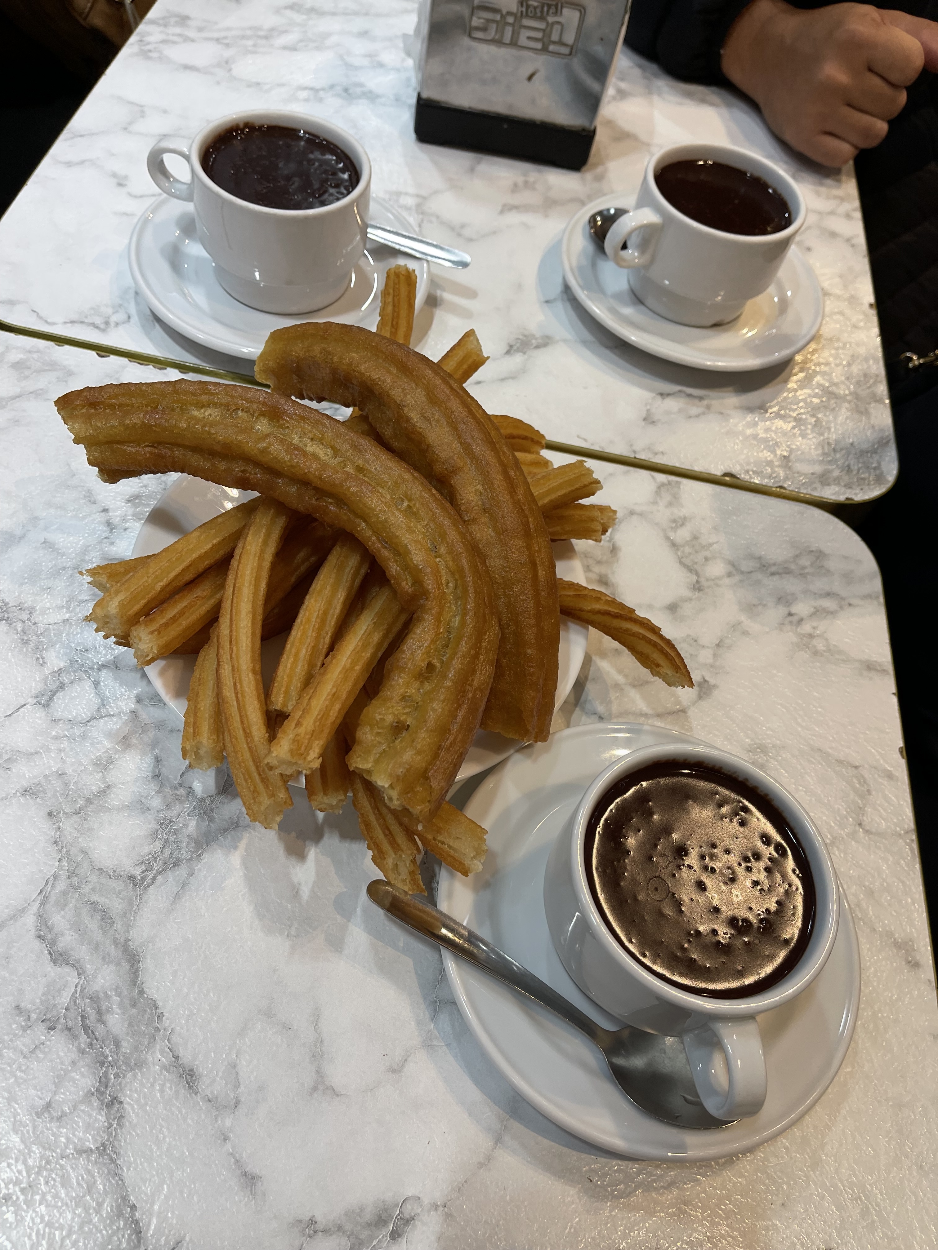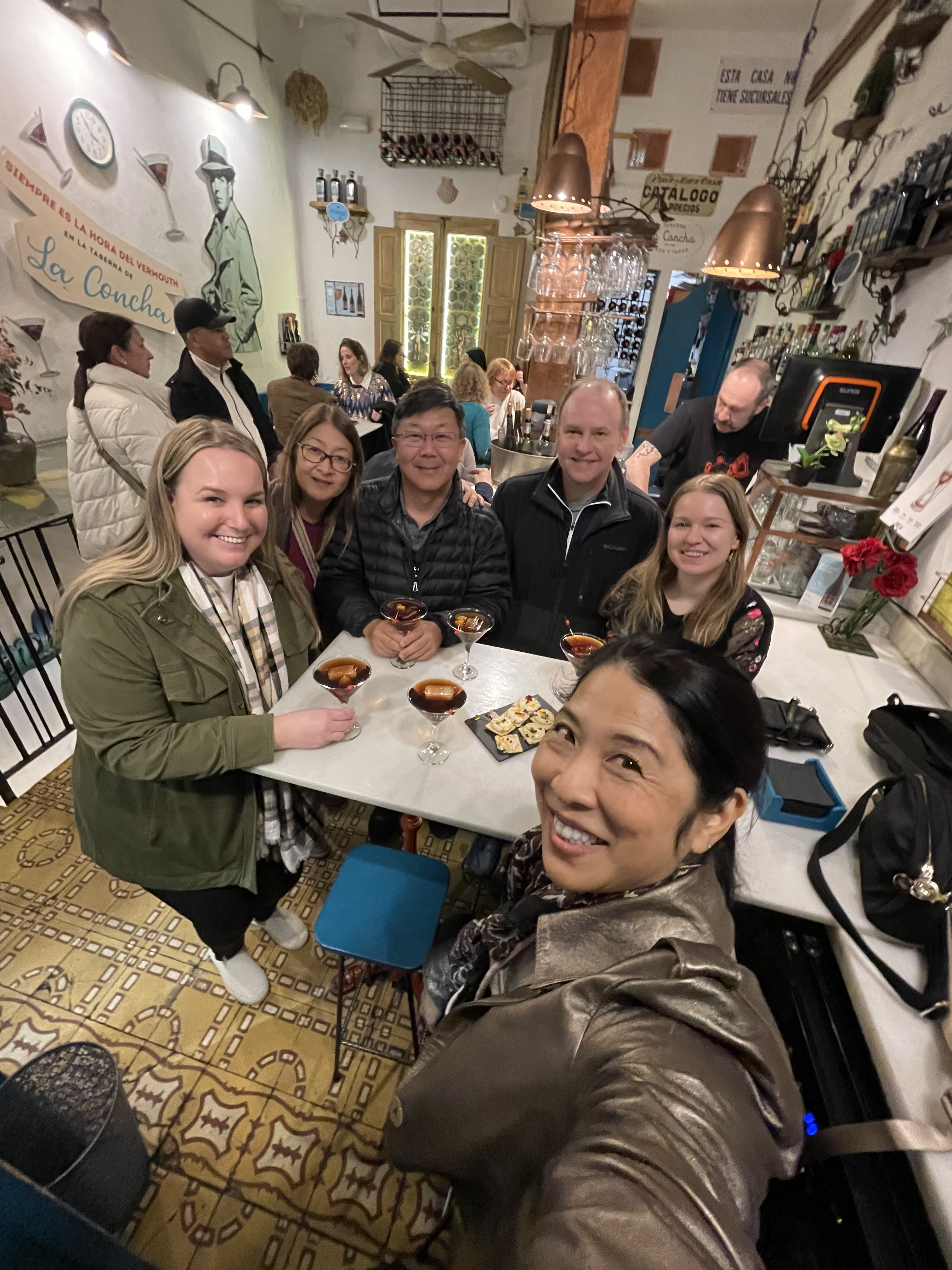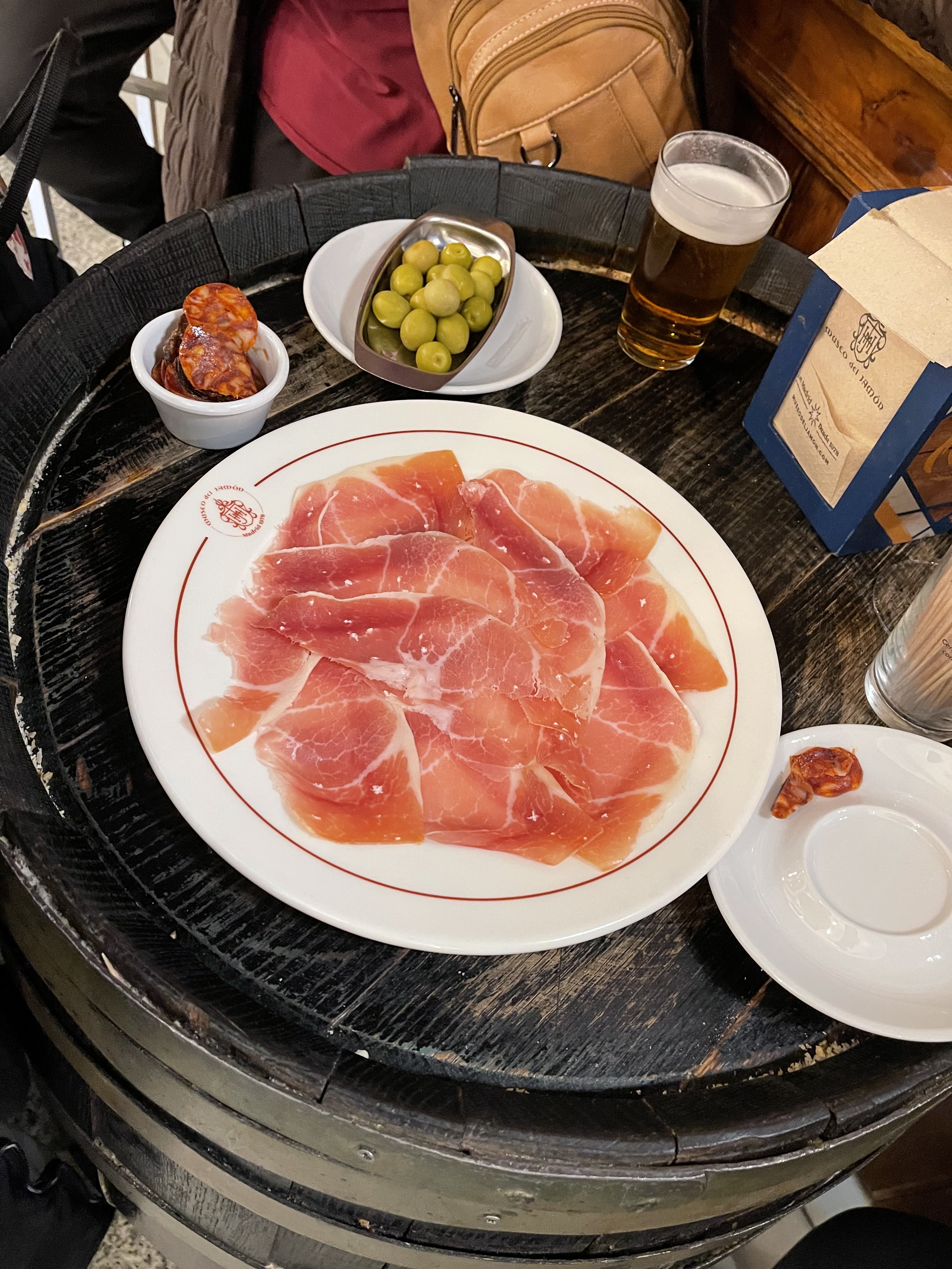 We left Bilbao on a 7 a.m. train. and rode four and a half hours to get to Madrid. We stayed at the Hotel Aloft Madrid, which is in a great location. It is just steps away from restaurants, shopping, and sights. After checking in, we stopped for paella at El Barril de las Cortes. I was waiting for paella on this trip and it did not disappoint. After lunch, we met Majo, our guide for our walking tour of Madrid. Throughout the walk, I kept being amazed by the beauty and history of Spain. We saw the Plaza de Isabel, Madrid Royal Palace, and other stops I neglected to jot down the names of. We ended at Plaza Mayor where we had some jamon and beer to finish our walking tour. Caroline’s friend Emma met up with us there and extended our tour. This portion was the food and drink tour. Emma took us to Tapas Street, just around the corner from Plaza Mayor. Our first stop was a place famous for their fried-calamari sandwich and beer. Fried calamari is all they serve, and they have their service down to a science. After enjoying crispy calamri, our second stop was at place famous for vermouth. I’ve never had vermouth as a drink but this is a popular cocktail in Spain. I was pleasantly surprised by this drink. The bartender sprayed the glass and ice with gin, poured some good vermouth in a martini glass, and topped it with bitters. The cocktail was garnished with an olive and at this place a dried orange slice. At all the other places I tried vermouth on the trip, the garnish was an olive with a fresh olive slice. The next two stops were for more tapas and beer. There was even a dish described as having eels, but it wasn’t actually eels. It was actually surimi shaped like baby eels and was pretty good. We ended the evening at a shop where we devoured warm crispy churros we dipped in melted chocolate. What a perfect end to the evening.