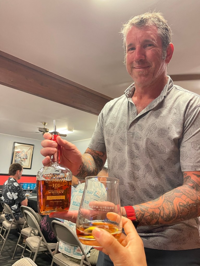 Ryan Kadota of Kadota Liquor visited the distillery a few years ago. Ryan and a wine sommelier friend blended a couple of bourbons to meet the taste of our Hilo palate. If you’re intrigued, you can find it at Kadota Liquor. Ask for Ryan and ask him to tell you about the Maker’s Mark Kadota Private Selection Volume 3 and Volume 4. They were both very popular this evening.